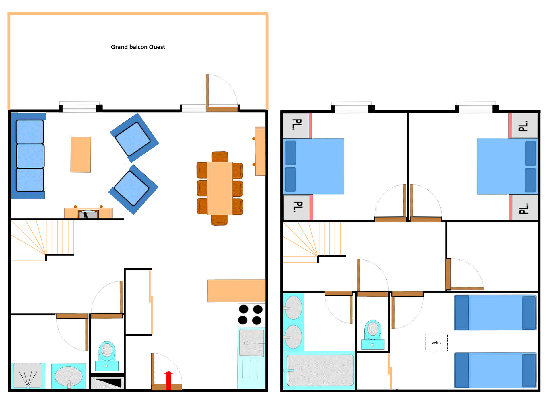 Niveau 0 : Cuisinette équipée : micro-onde / grill, réfrigérateur/congélateur, 4 plaques électriques, lave vaisselle.