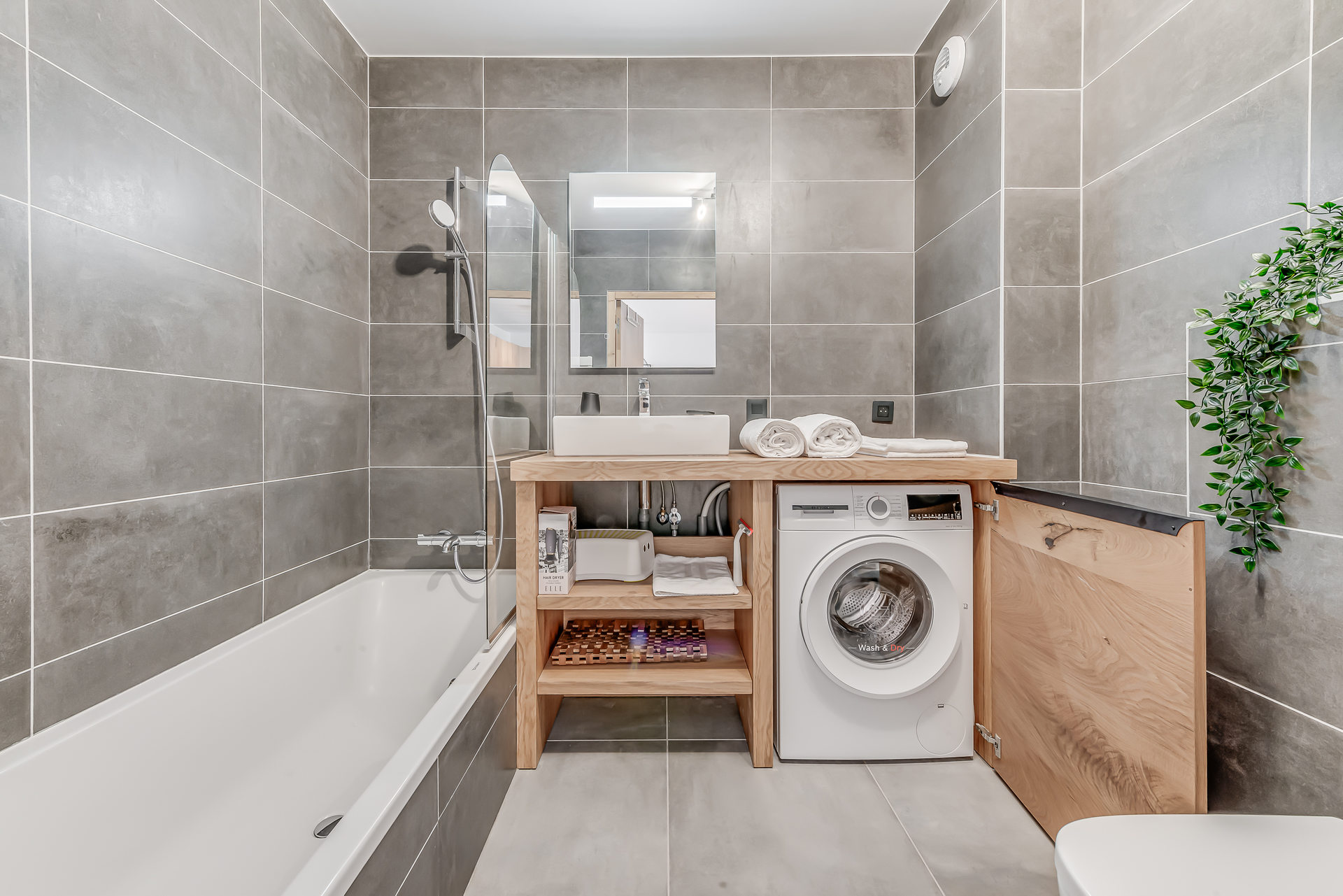* Salle de bain avec baignoire, meuble vasque, radiateur seche serviette et Lave-linge.