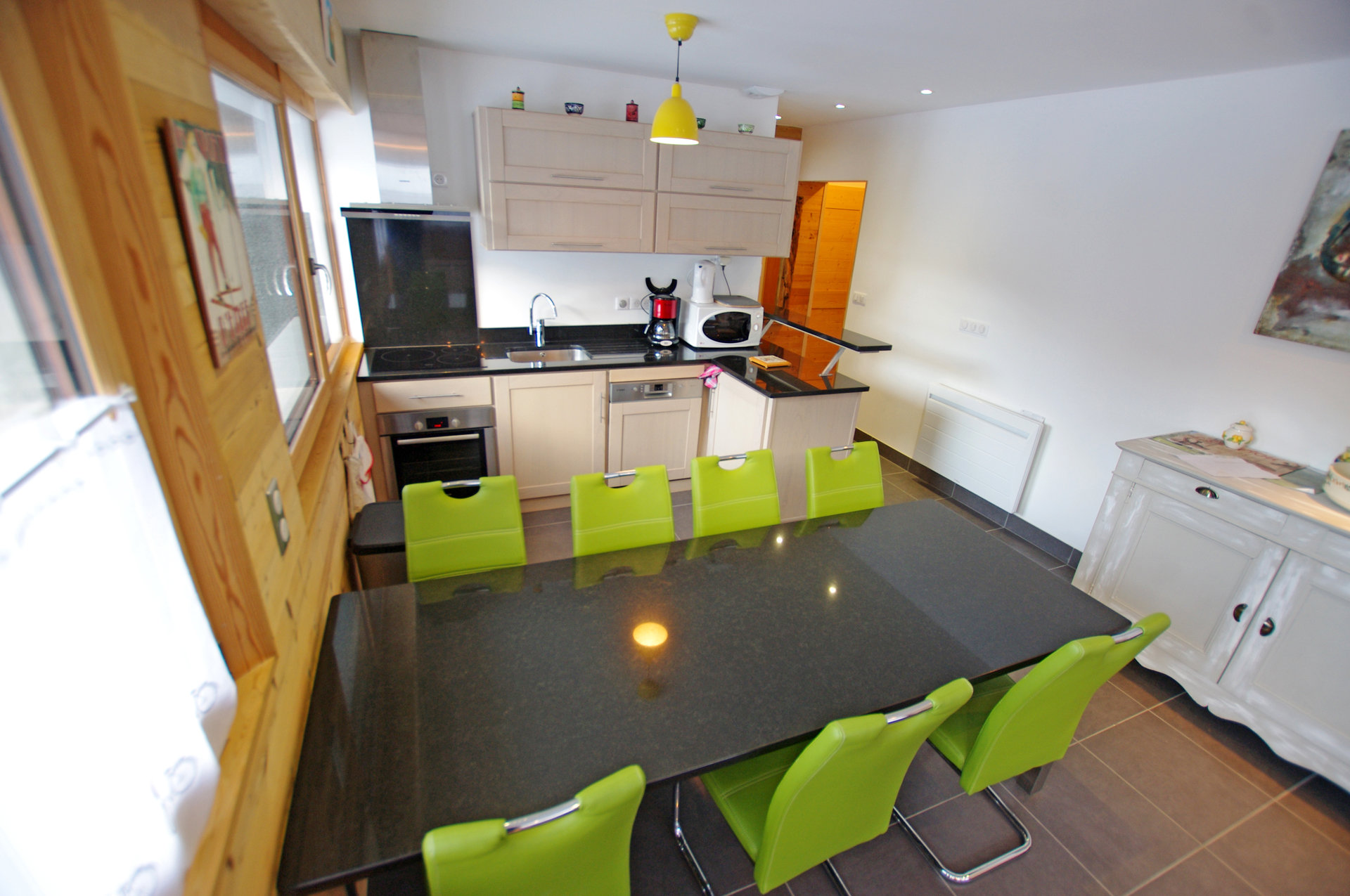 - Cuisine americaine tres bien equipee : frigo avec partie congelateur, four, micro-ondes, plaque vitroceramique, lave-vaisselle, cafetiere electrique, grille-pain, bouilloire et toute la vaisselle necessaire; ouverte sur le coin repas et le salon. Television