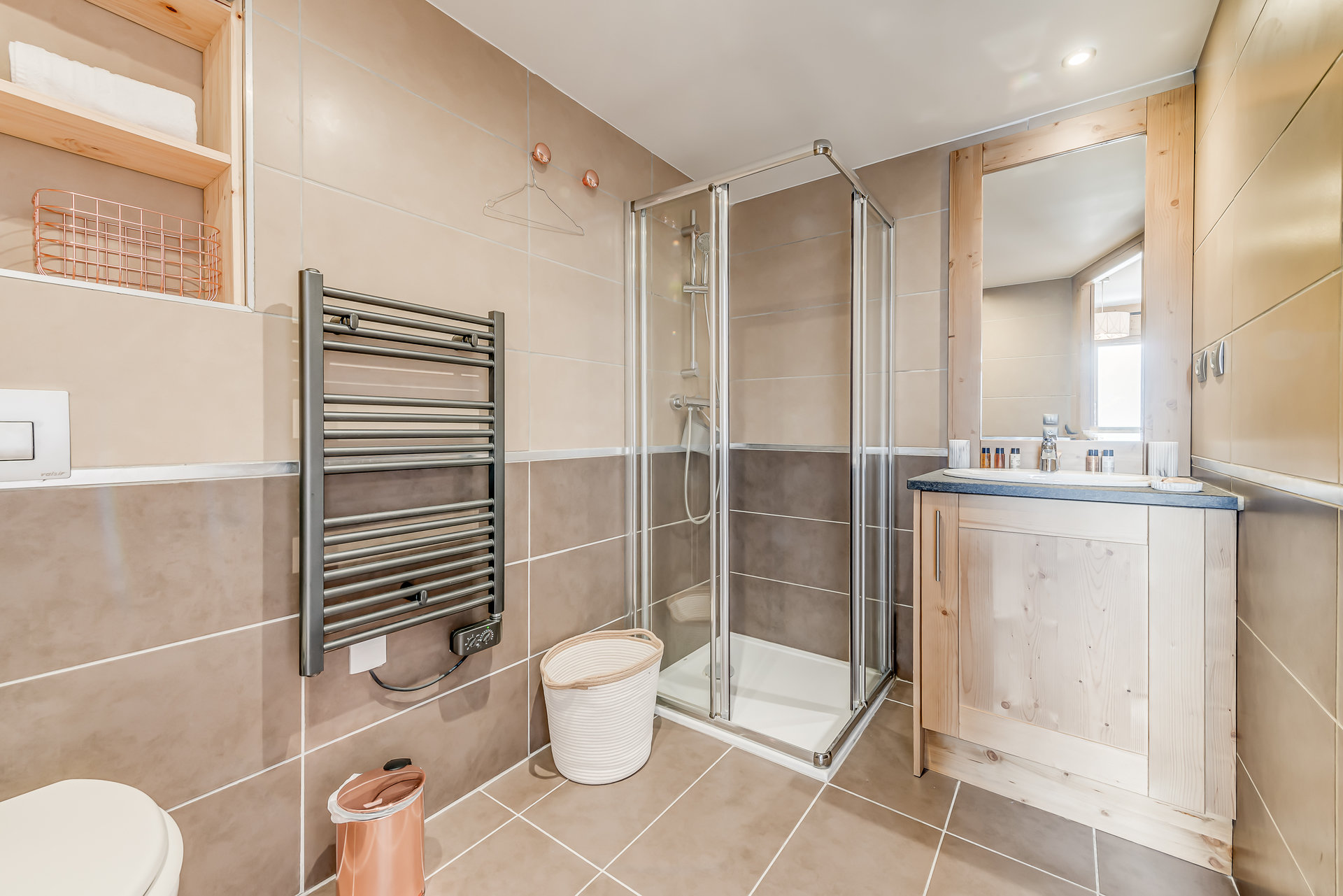 - Salle de douche : douche, meuble vasque, sèche serviette, sèche cheveux, toilette
