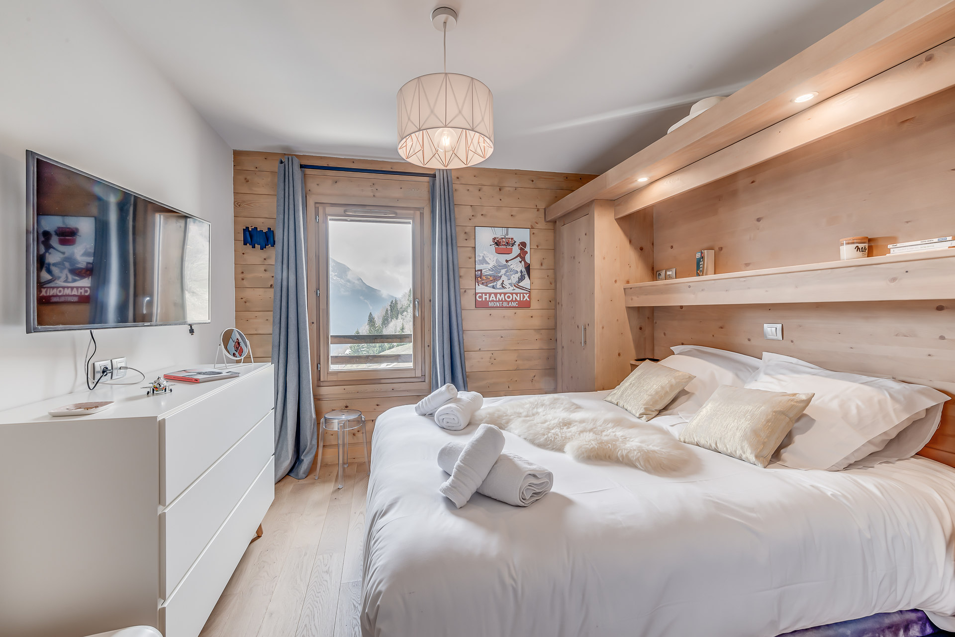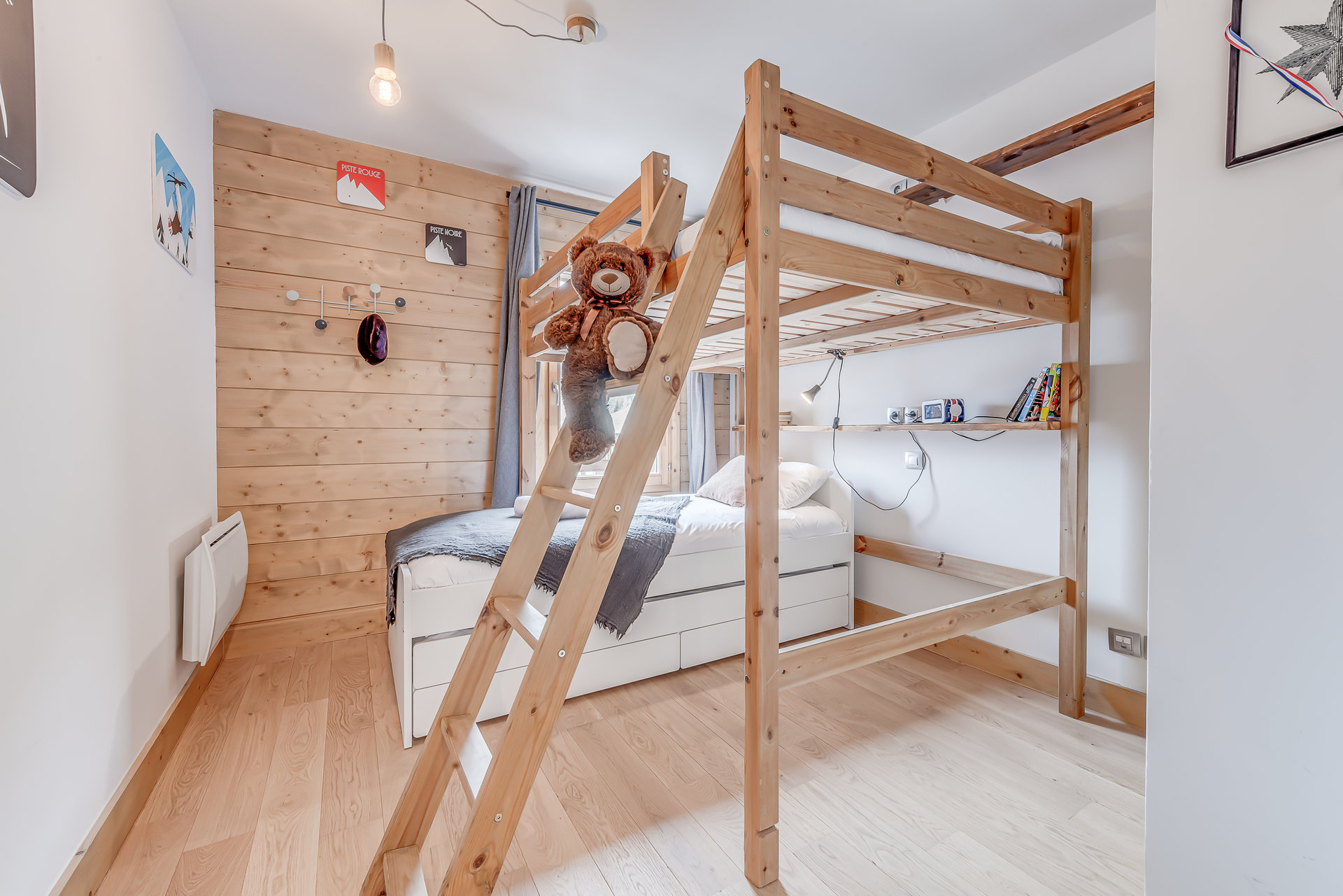 - Chambre 2 : 1 lit mezzanine double (140x200) et 1 lit simple (90x200), chevet, lampe de chevet, placard avec étagère et penderie