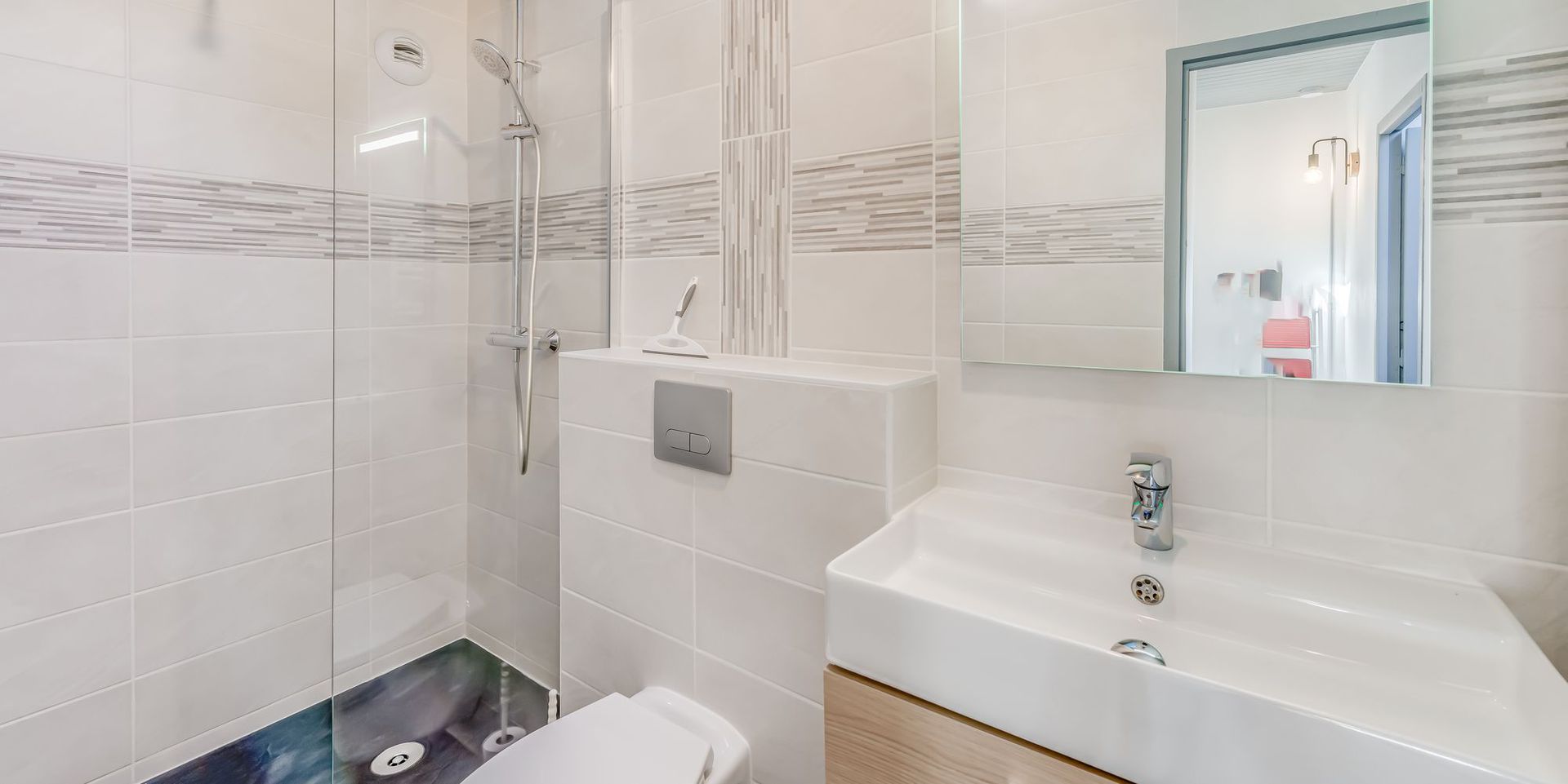 * une salle de douche avec douche a l'italienne, lavabo et toilettes
