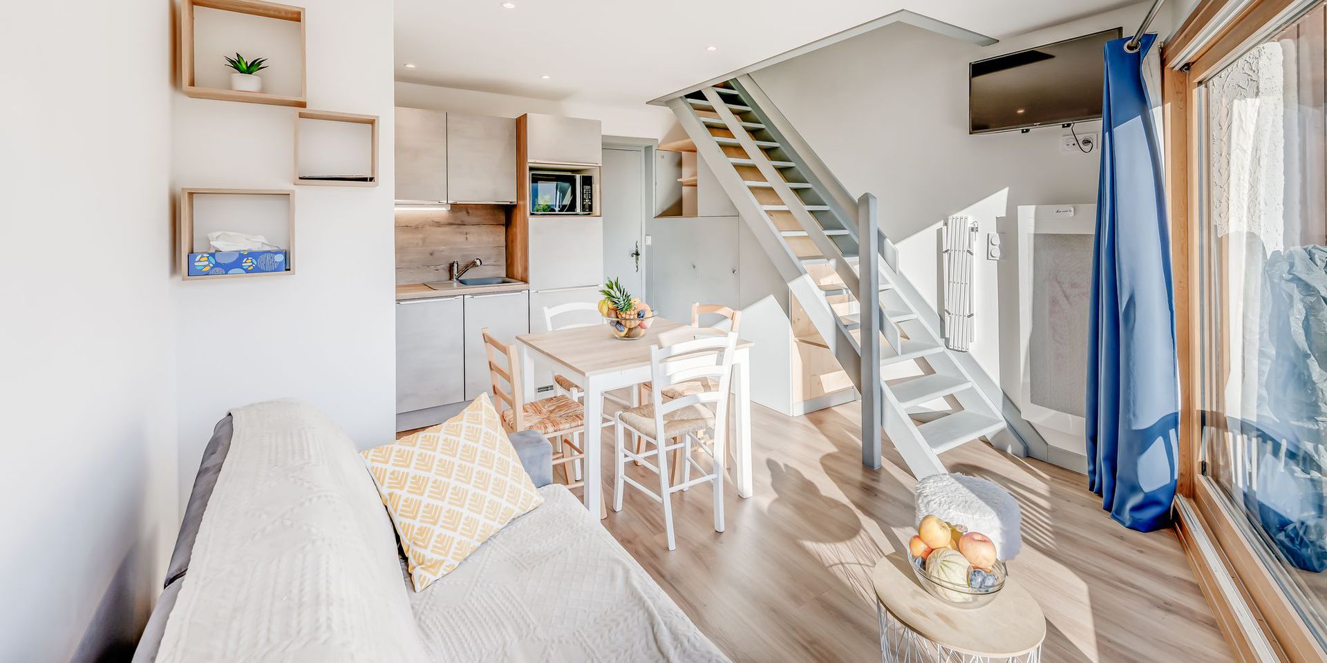 * grande piece avec baie vitree, salon avec canape lit 2 pers. (140x190), couettes , television, coin repas, cuisine amenagee : four, micro-ondes, lave-vaisselle, grand frigo avec petit congelateur, cafetiere electrique, grille-pain, bouilloire et vaisselle complete