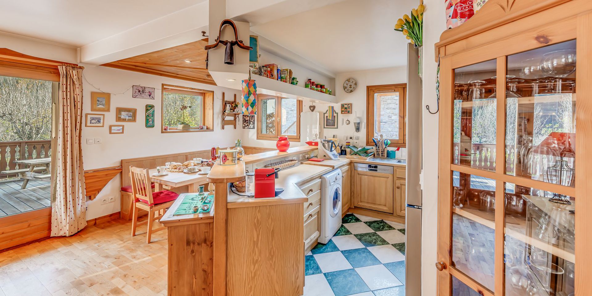 - Salle a manger rattachee a la cuisine avec table de repas et bancs en U