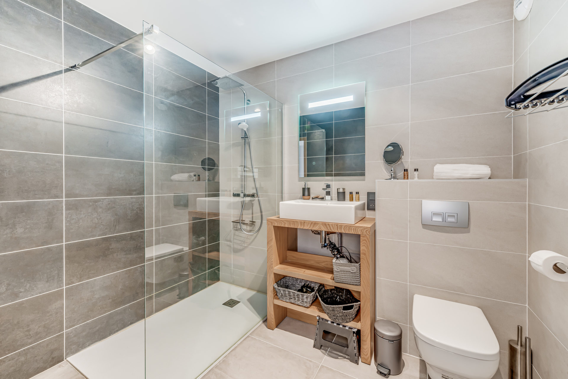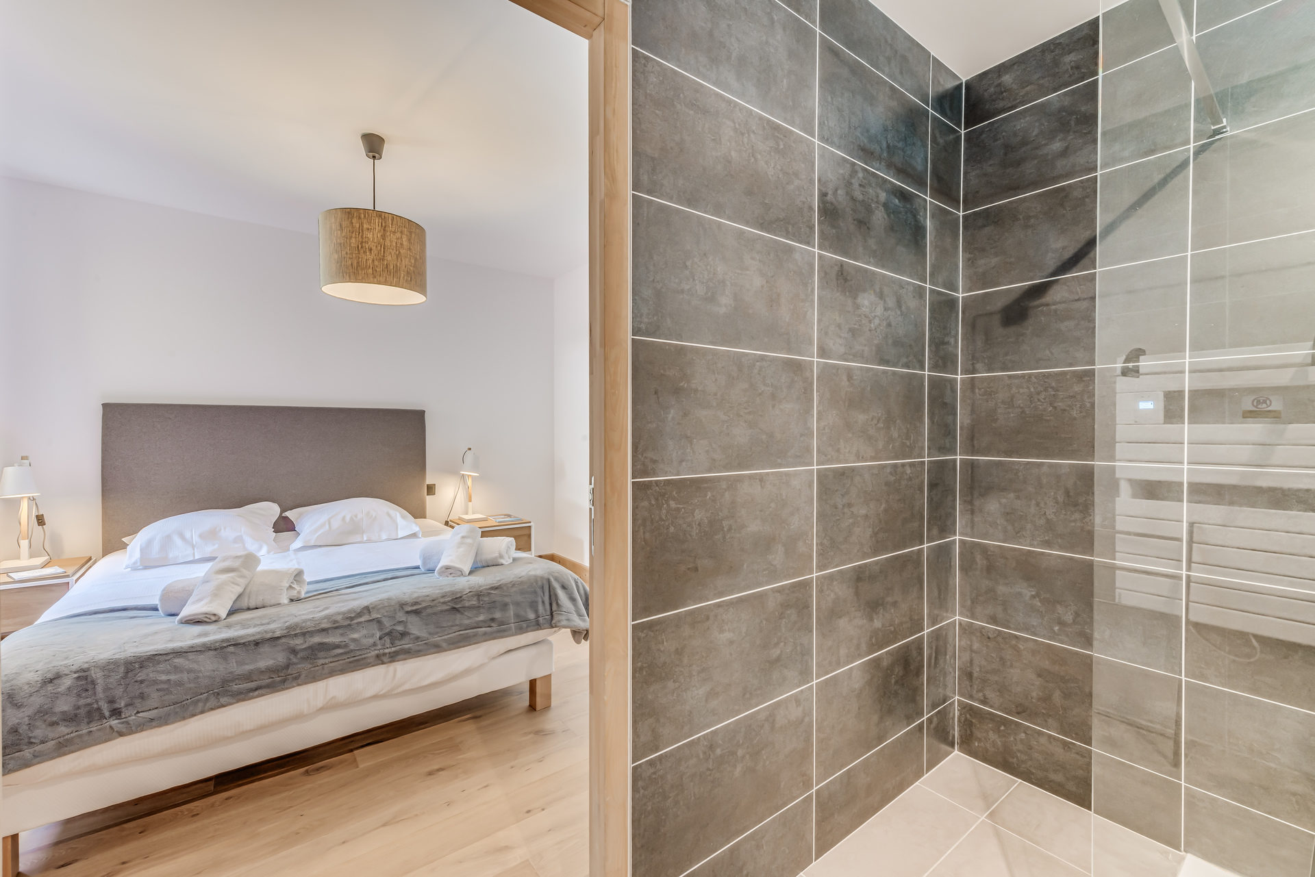 - Chambre 1, suite parentale avec 1 lit double (160X200) avec armoire de rangement et sa salle de douche avec WC, meuble vasque, seche serviettes