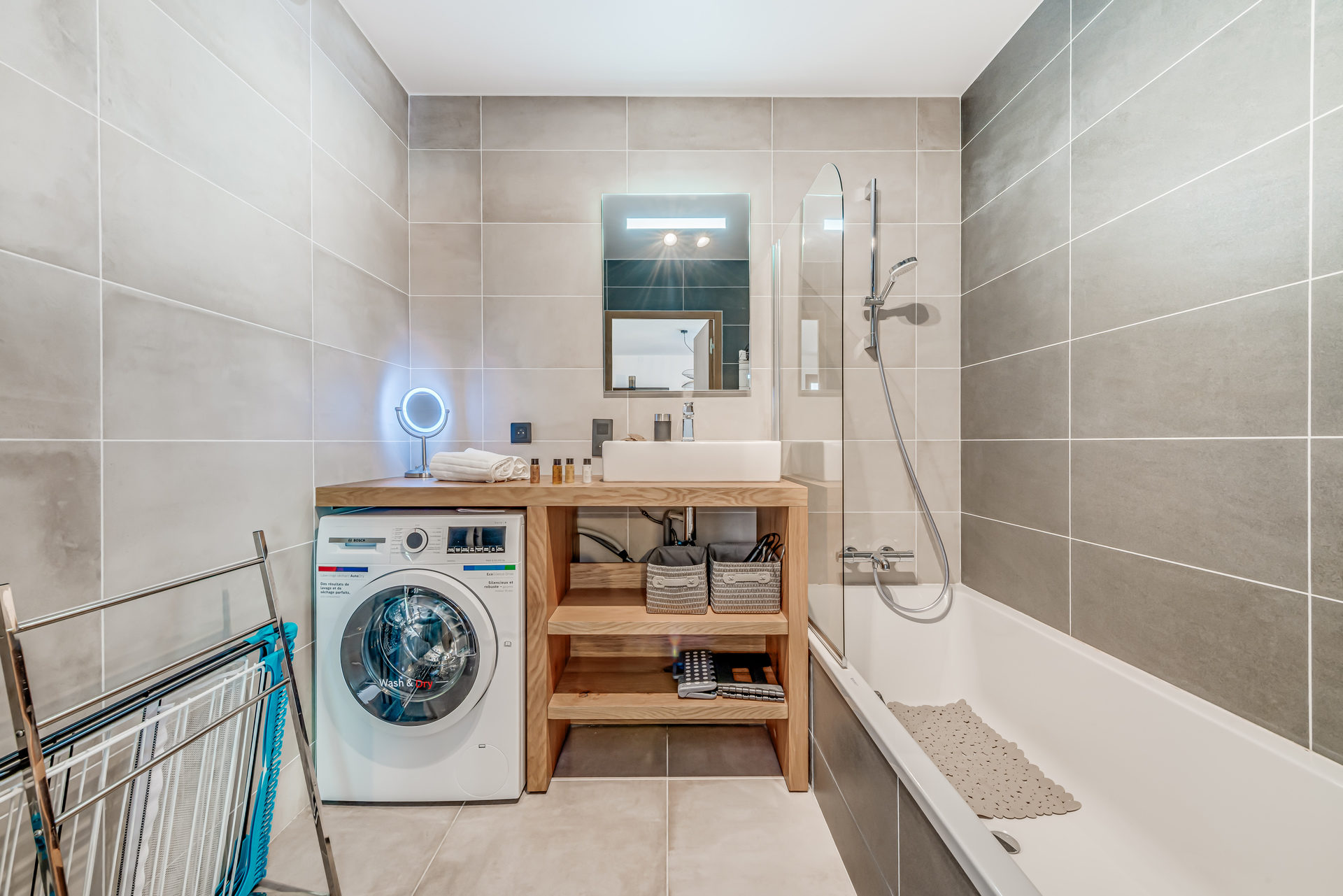 - 1 Salle de bains avec baignoire, seche serviettes et lave-linge sechant