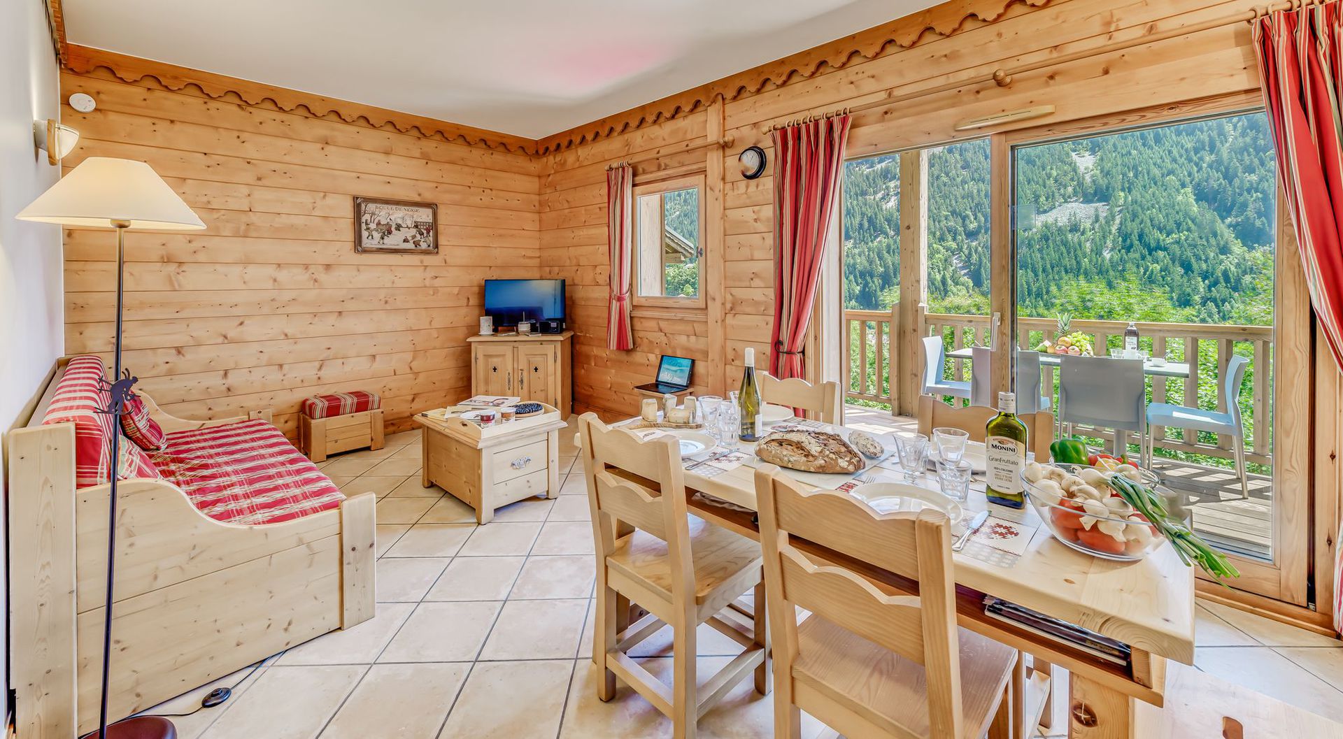 - 1 Balcon/terrasse SUD, deck bois avec tables et chaises et vue sur la Vanoise et Courchevel