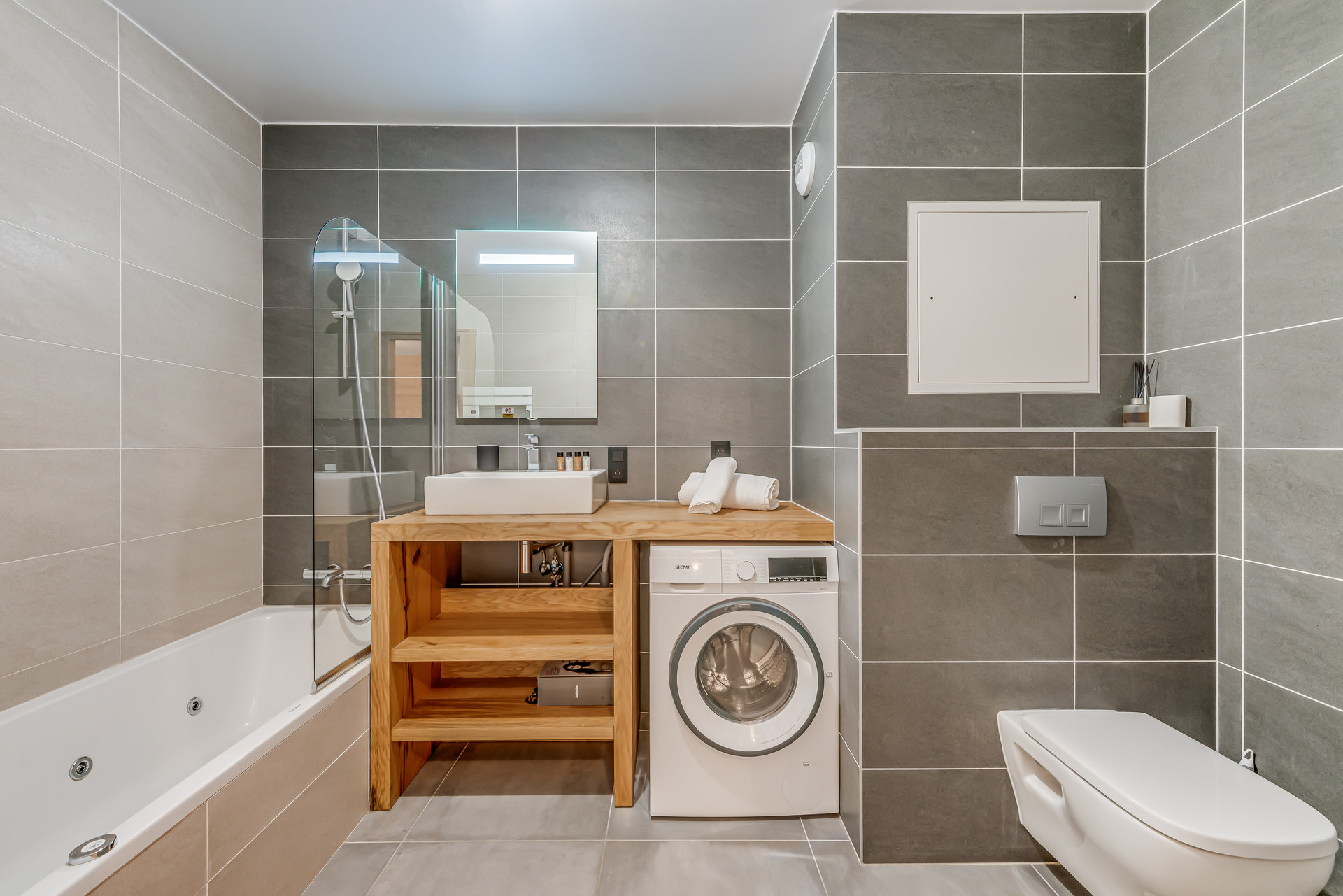 - 1 Salle de bains avec baignoire avec jets balneo, lave-linge sechant et WC