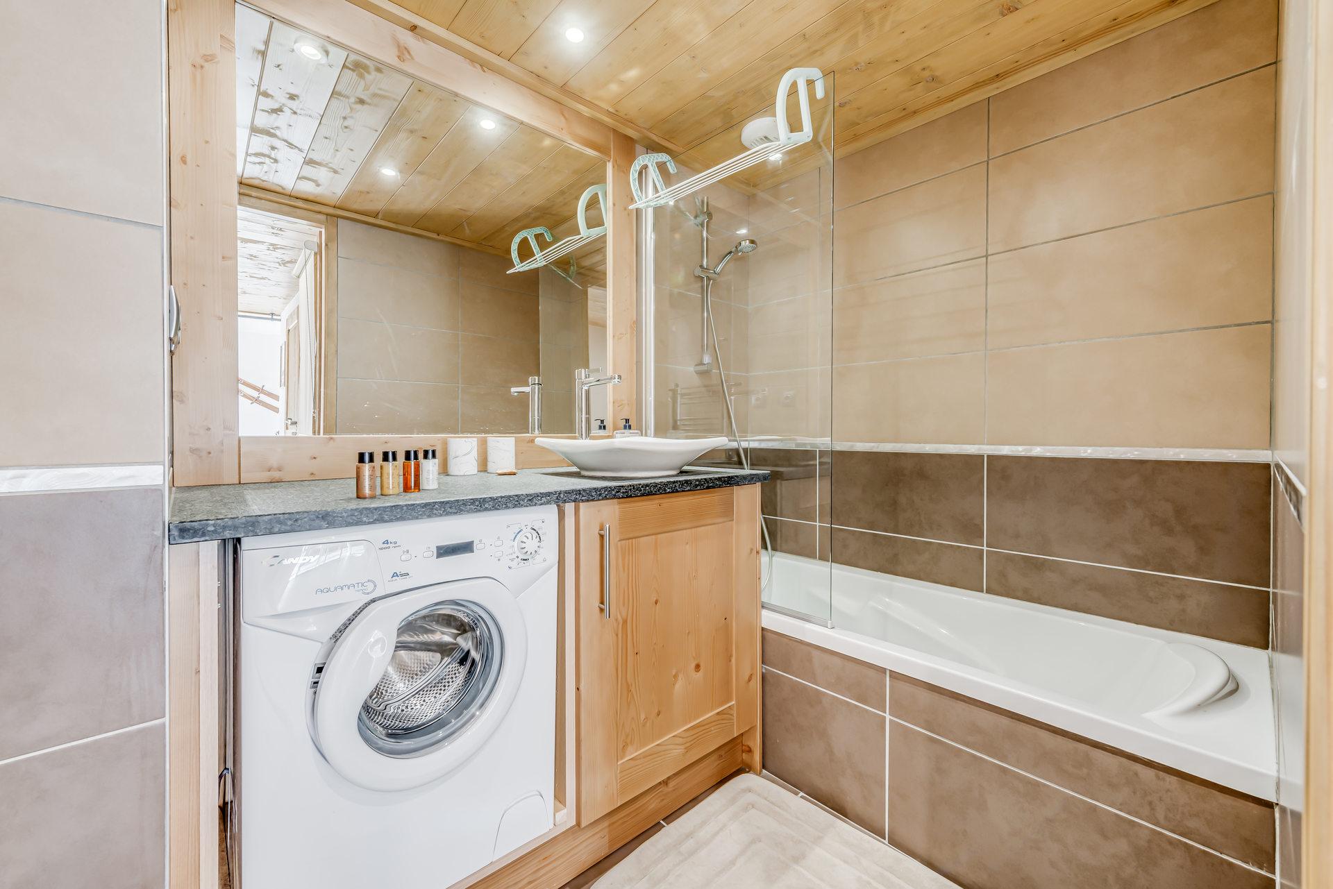 * Salle de bains : baignoire, meuble vasque, seche serviette, machine a laver