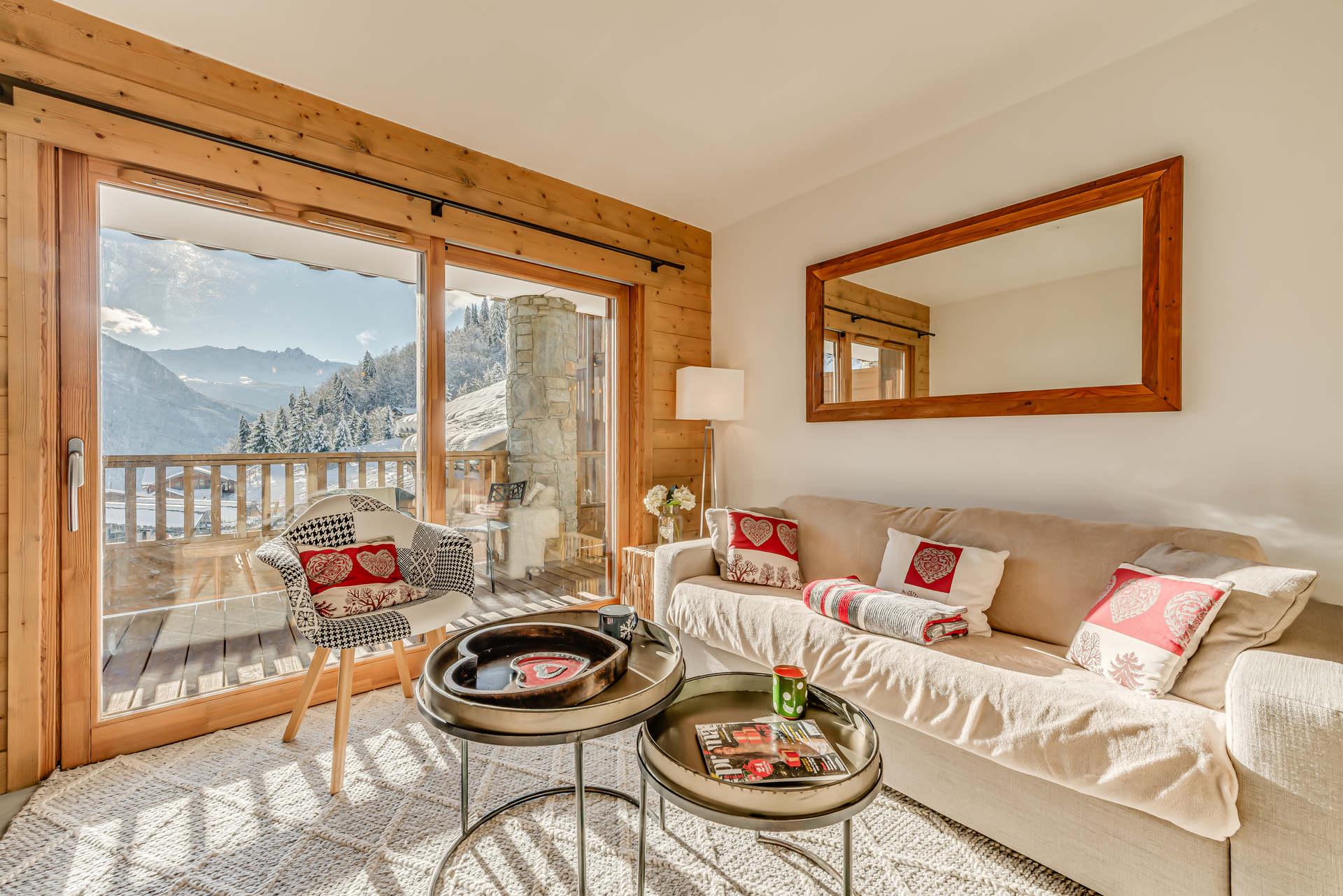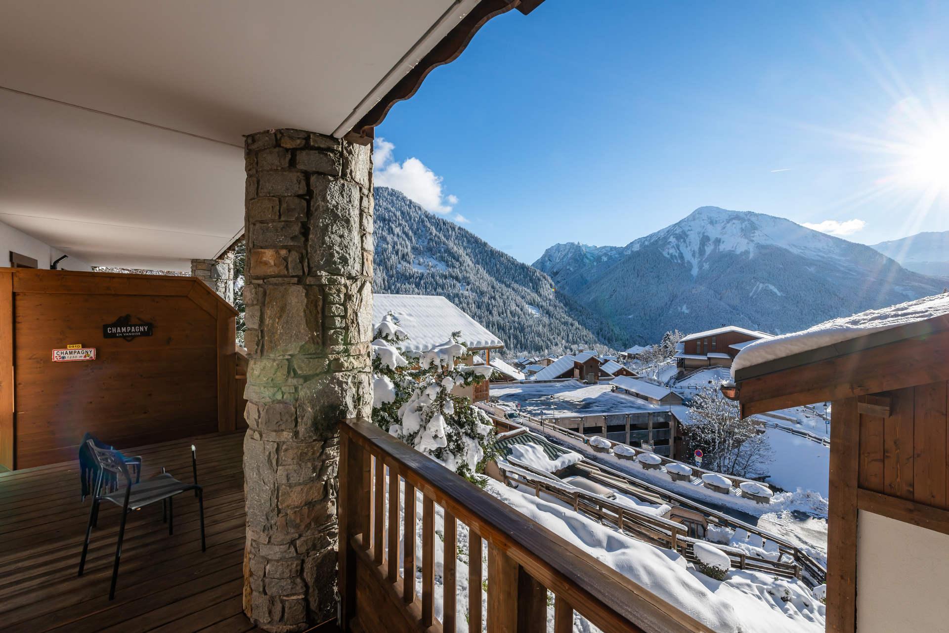 Il est compose d'un sejour avec balcon oriente Sud, d'une cuisine completement equipee avec coin repas, de 2 chambres independantes, d'une salle de bains avec toilettes separees et d'une salle de douche avec toilettes, d'une grande terrasse de 12 m2 totalement amenagee avec vue sur les montagnes et Courchevel.