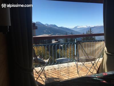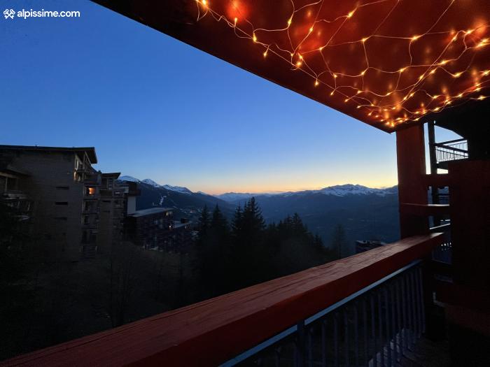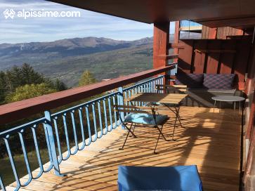 * Large balcon orienté sud-ouest, belle vue sur la vallée : 2 tables bistro, 2 chaises et 2 transats, 1 banc
