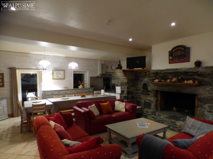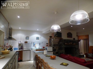 (une imposante cheminée de pierres dans le séjour, une discrète déco chalet),