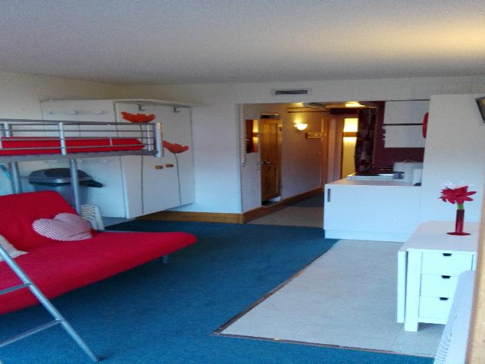 STUDIO 4/5 PERSONNES avec coin montagne lit superposé coin kitchenette neuf une salle de douche avec lavabo et WC séparé dans le salon une mezzanine 1 personne avec canapé lit 2 personnes pratique et fonctionnel. Les animaux sont admis avec un supplément de 15 € par semaine.