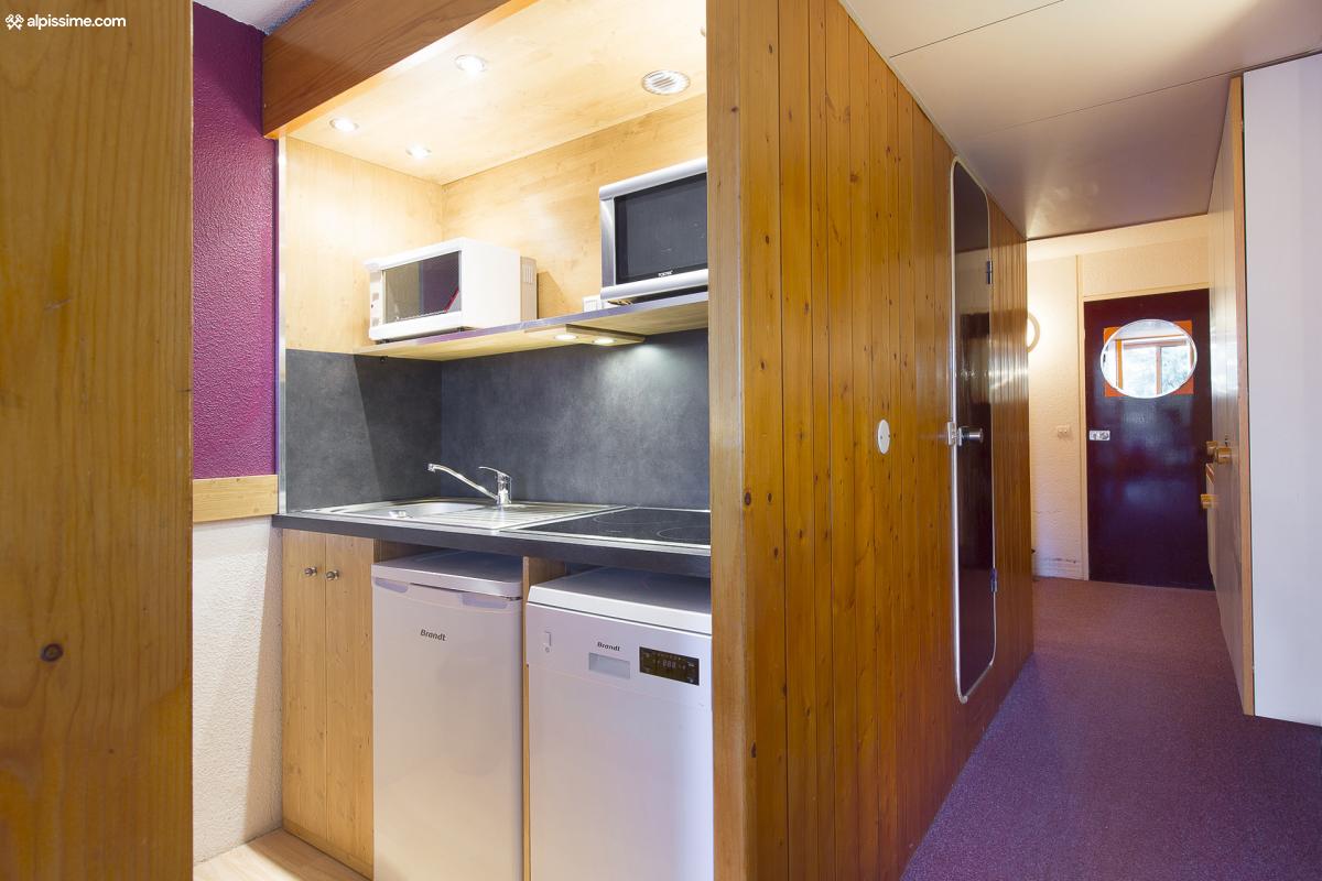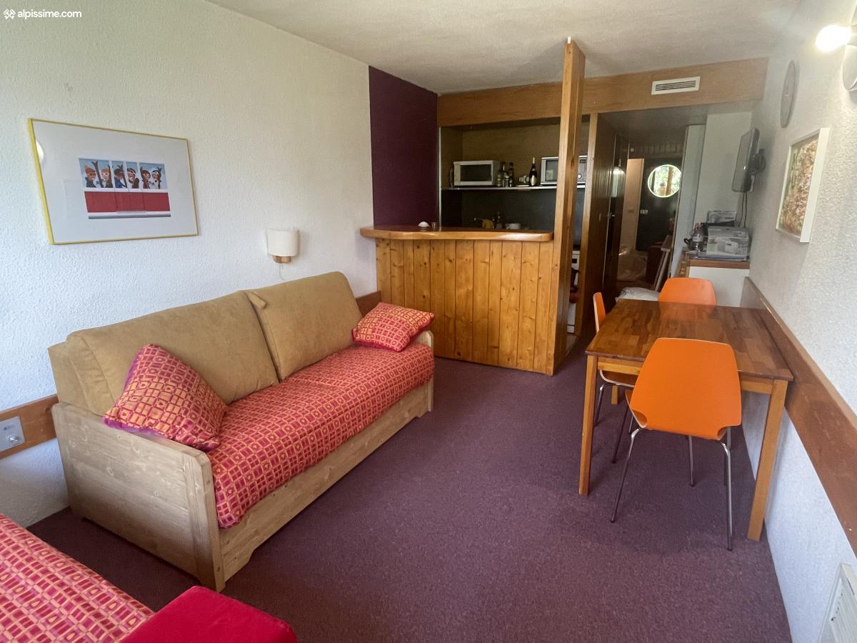 Le studio Les Lauzières n° 1389 : 28m², exposition nord-est avec balcon, pièce de vie avec coin salon (1 canapé-lit convertible Rapido 140 + 1 banquette simple 80 servant de couchage), coin repas, cuisine ouverte rénovée et bien équipée, salle de bains avec baignoire et wc, 3 couchages dans l'entrée.