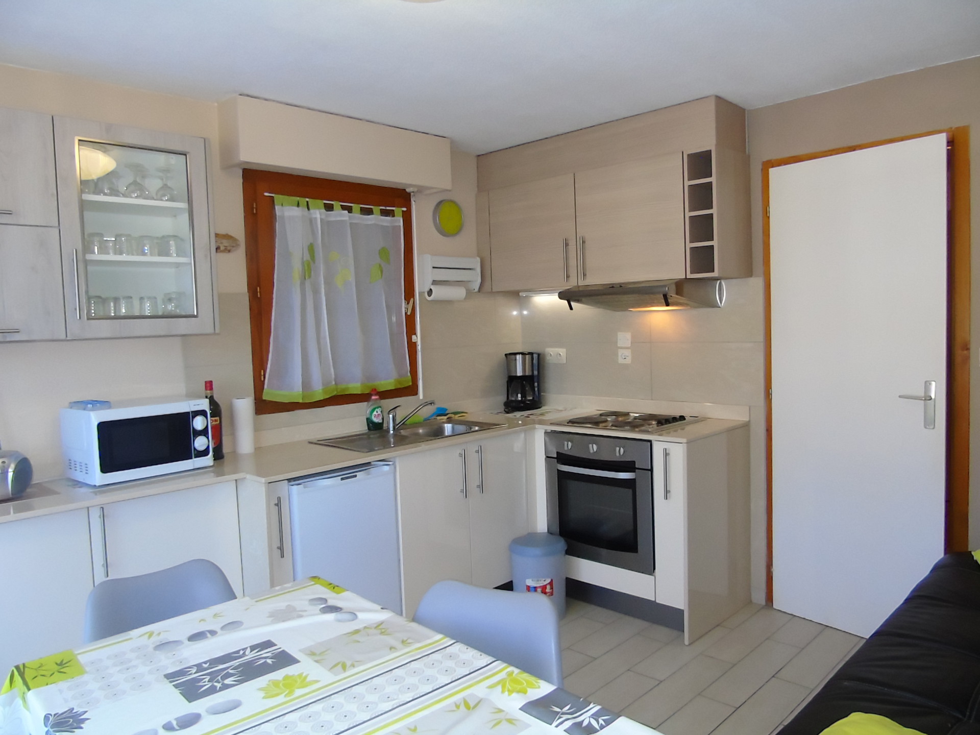 La cuisine est toute equipee, contenant une plaque de cuisson, un four, un micro-ondes, une cafetiere ainsi qu'un appareil a raclette.