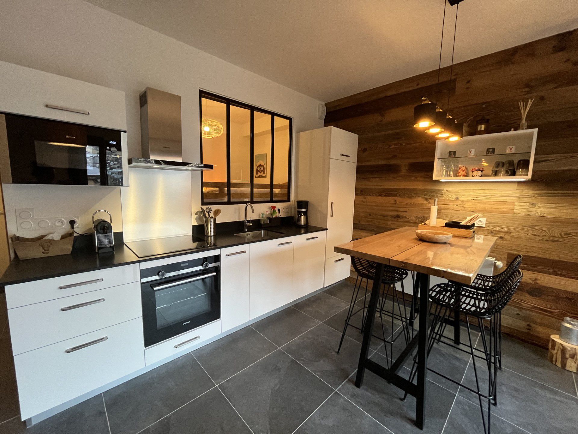 - Lave-vaisselle, four traditionnel, four micro-ondes, refrigerateur avec congelateur, cafetiere Nespresso (capsules non fournies), cafetiere a filtres, grille pain, appareil a raclette plancha et grill.