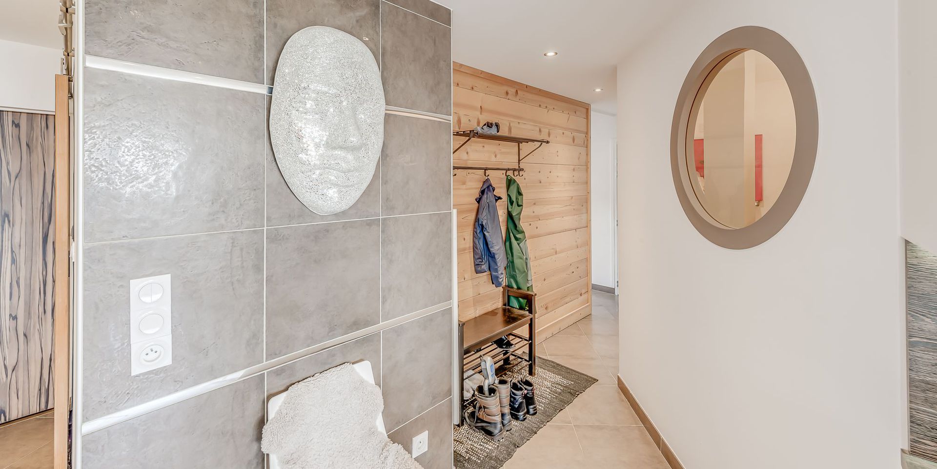 Une entrée pour se déchausser avec un radiateur sèche gants et bonnets.