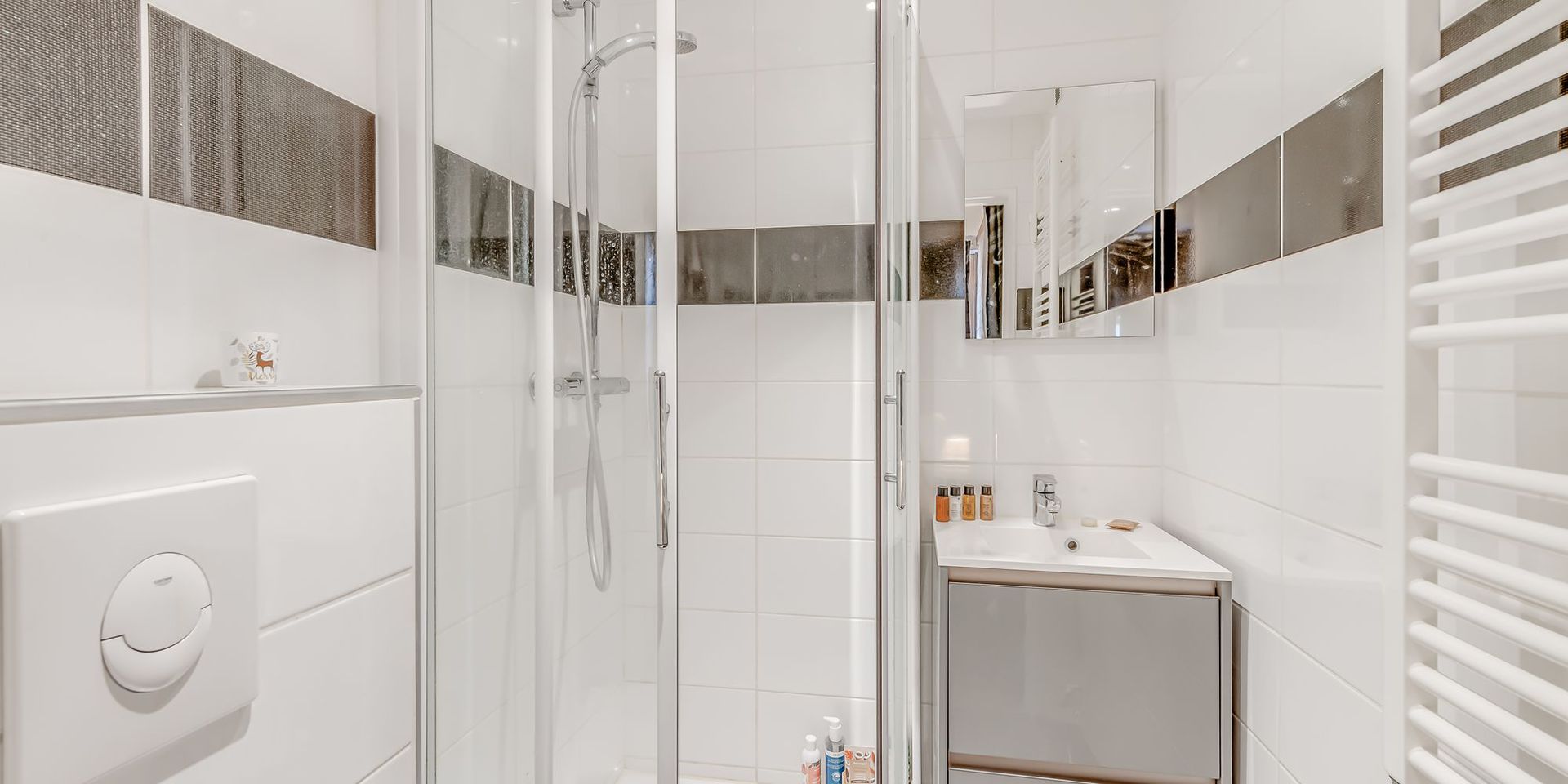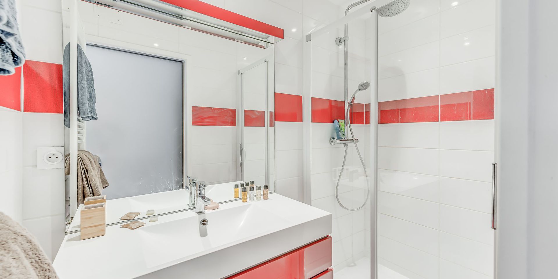 Une salle de bain avec douche, meuble vasque et radiateur sèche serviette.