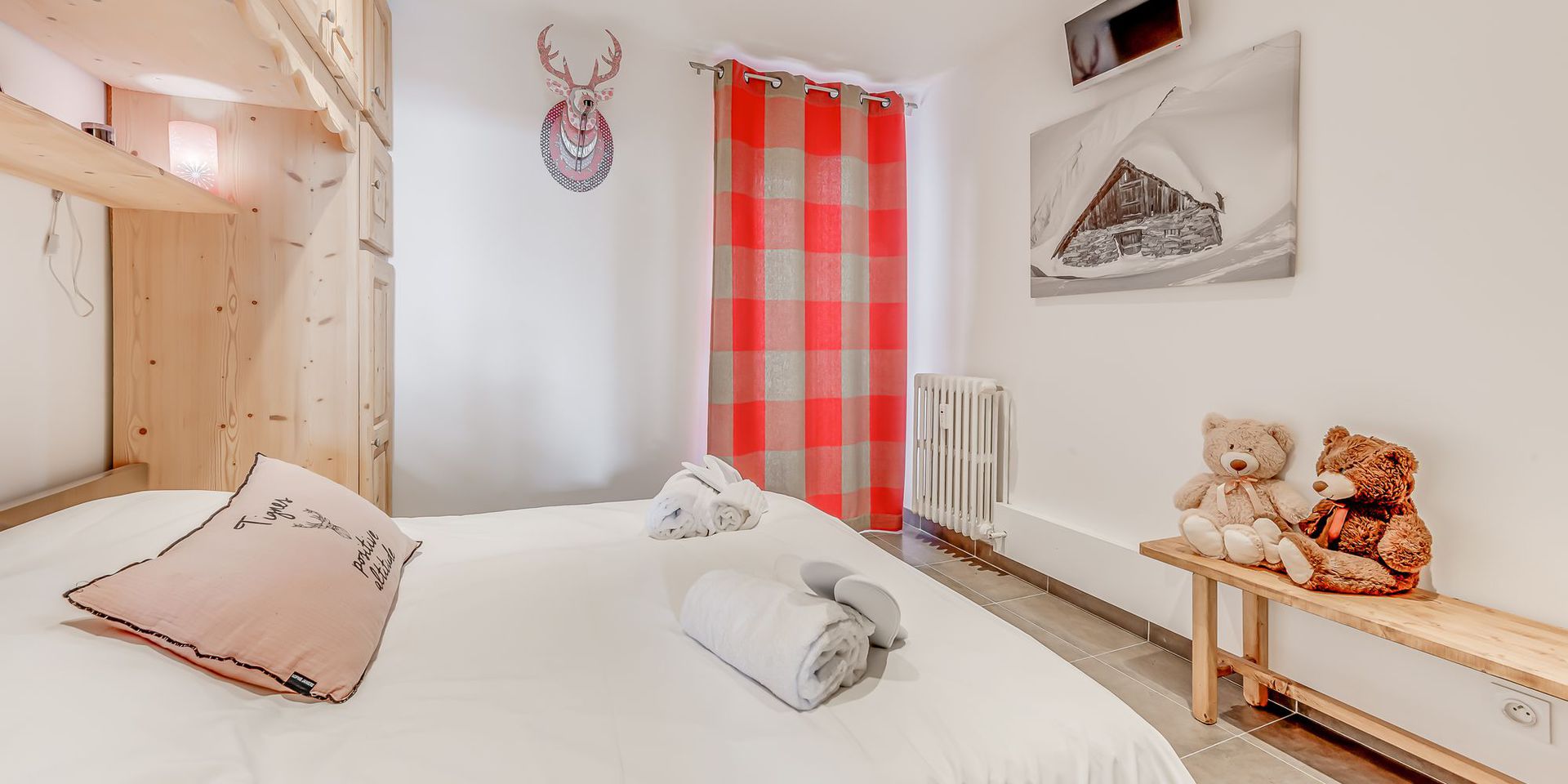 Chambre 2 avec deux lits simples, rangements et TV. Fenêtre NORD avec balcon.