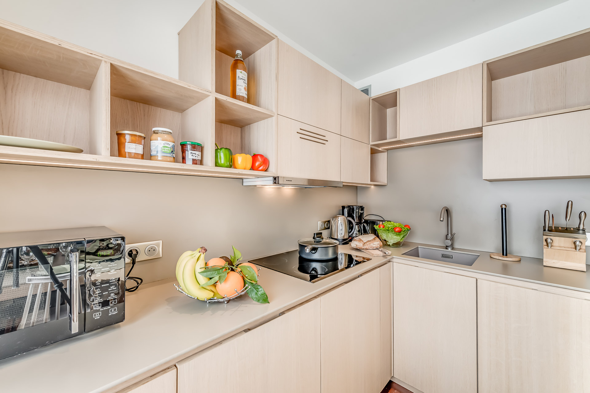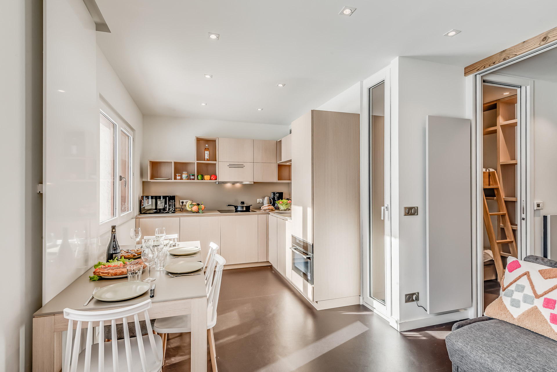 * cuisine ouverte entierement equipee ; lave-vaisselle, four, four micro-ondes, plaques vitroceramique, refrigerateur