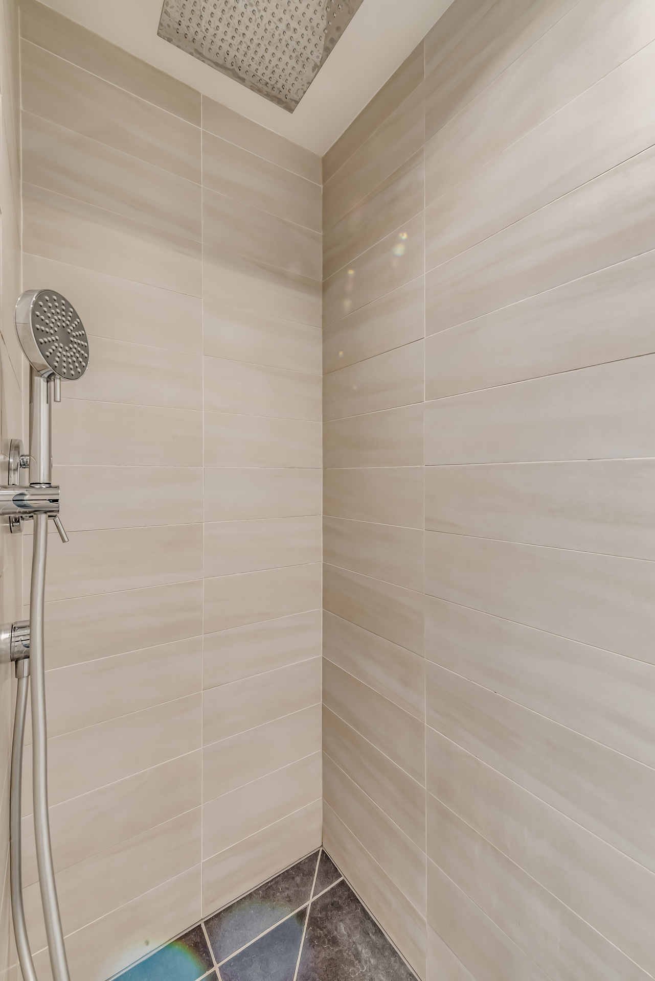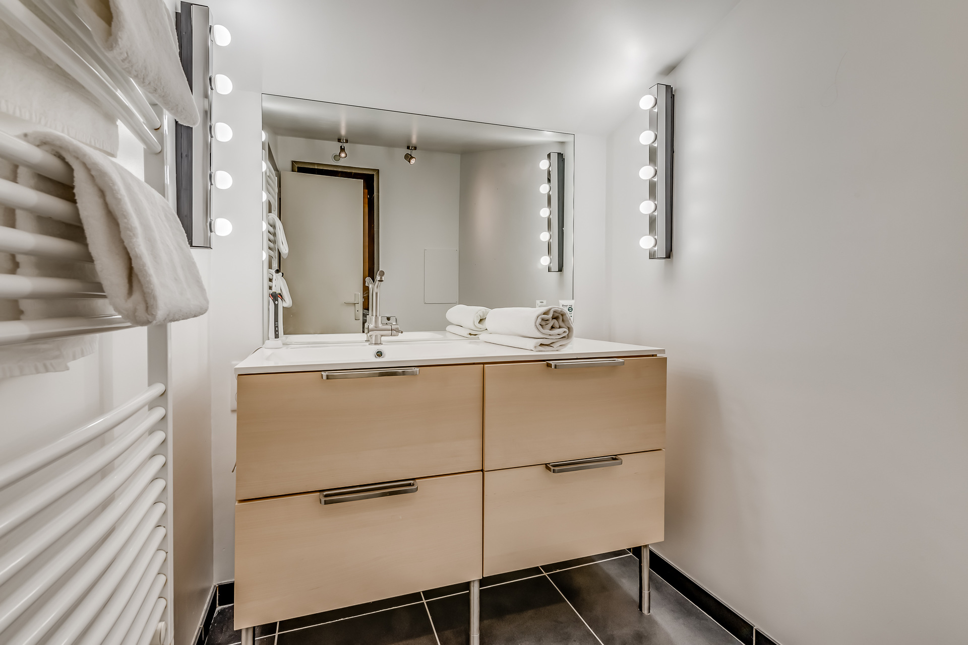 1 salle de bains avec meuble vasque, radiateur seche serviette, WC, douche a l'italienne.
