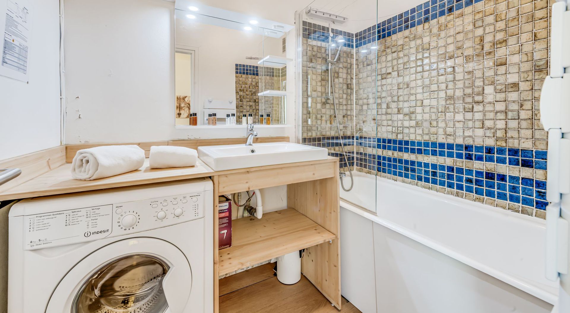 - 1 salle de bains avec baignoire et meuble vasque et lave-linge.