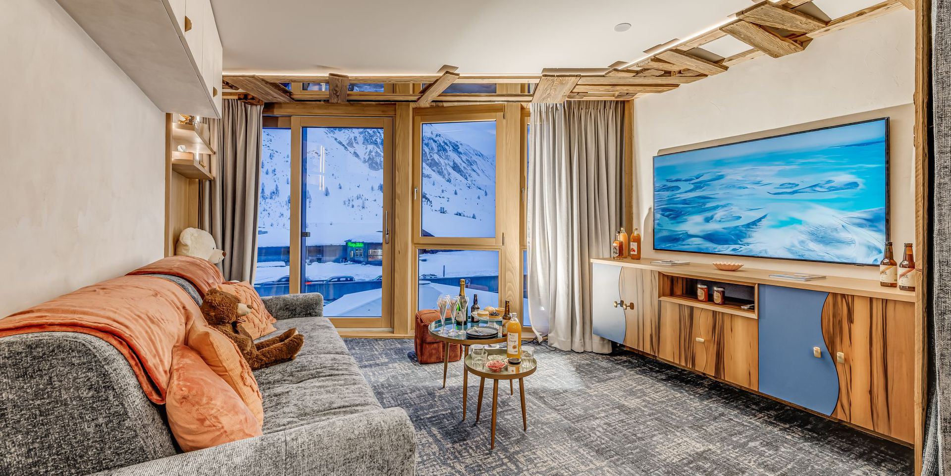 Sejour - salon oriente SUD - avec fauteuils, canape-lit double convertible et placards de rangement, grande TV, baies vitrees toute hauteur orientees SUD, vue Lac et Glacier de la Grande-Motte.