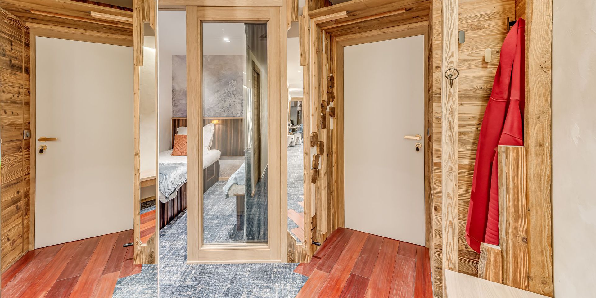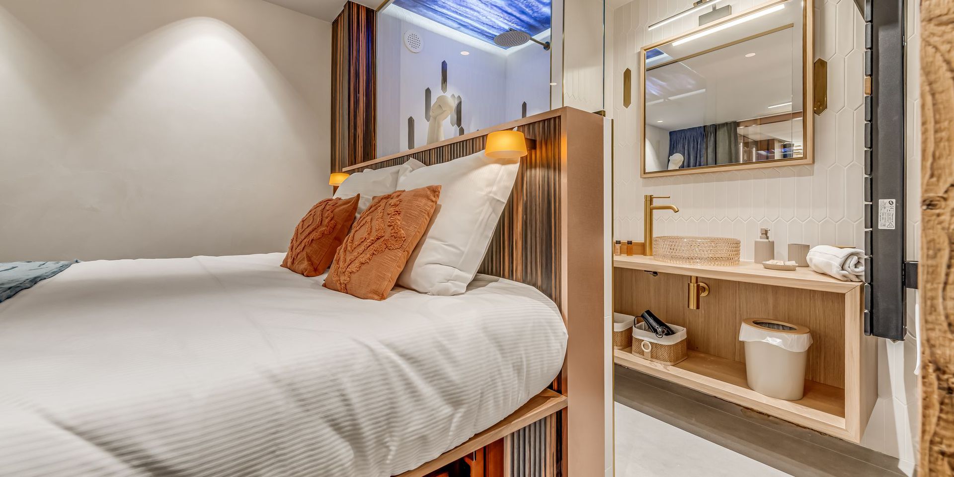 1 chambre - cabine, avec 2 lits simples au sols, rapprochables en lit couple. 1 lit superpose rabattable. 1 placard de rangement et 1 TV connectee. Fermeture de la chambre par cloison vitree coulissante. Rideau d'occultation. 1 salle de bains , avec douche a l'italienne, meuble vasque, radiateur seche-serviette, WC suspendu.