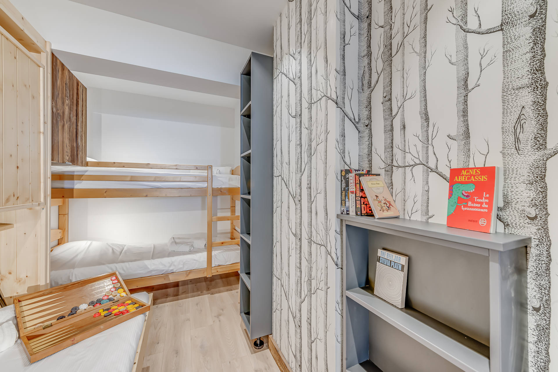 - 1 Chambre avec 1 lit simple bas, 1 lit rabattable mural et 2 lits superposes avec coin rangement pour chaque lit