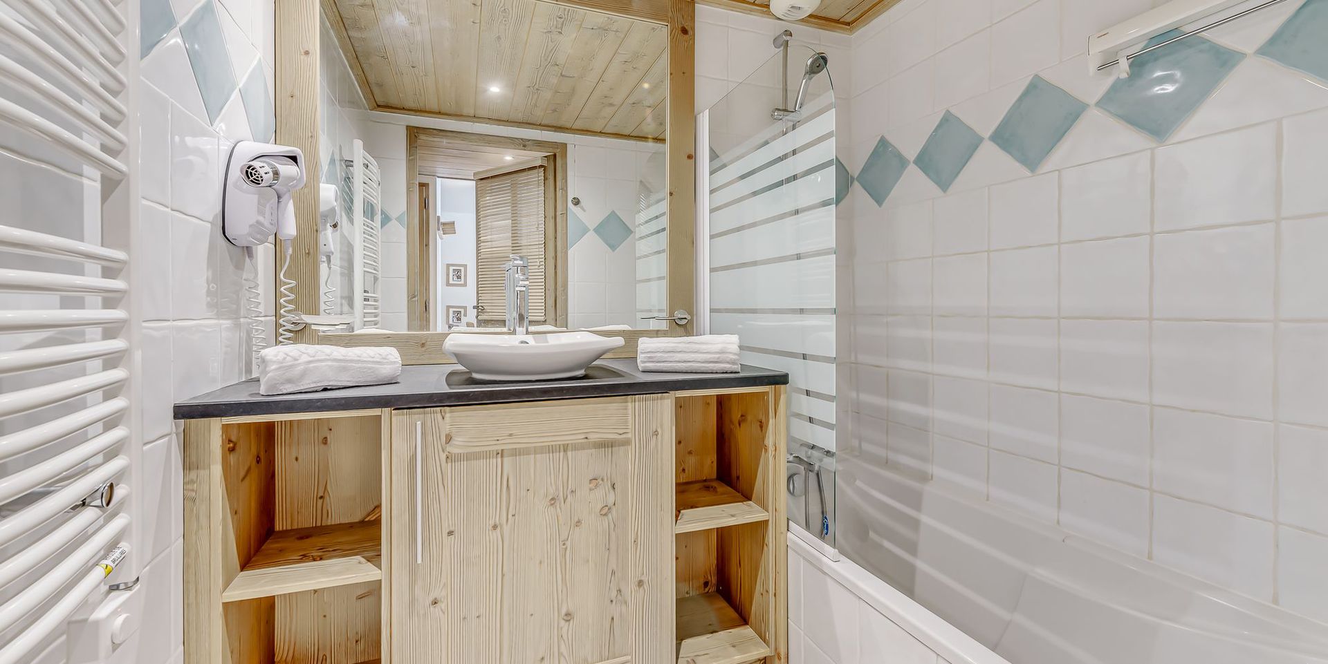 - 1 salle de bains avec baignoire, meuble vasque et radiateur seche serviettes