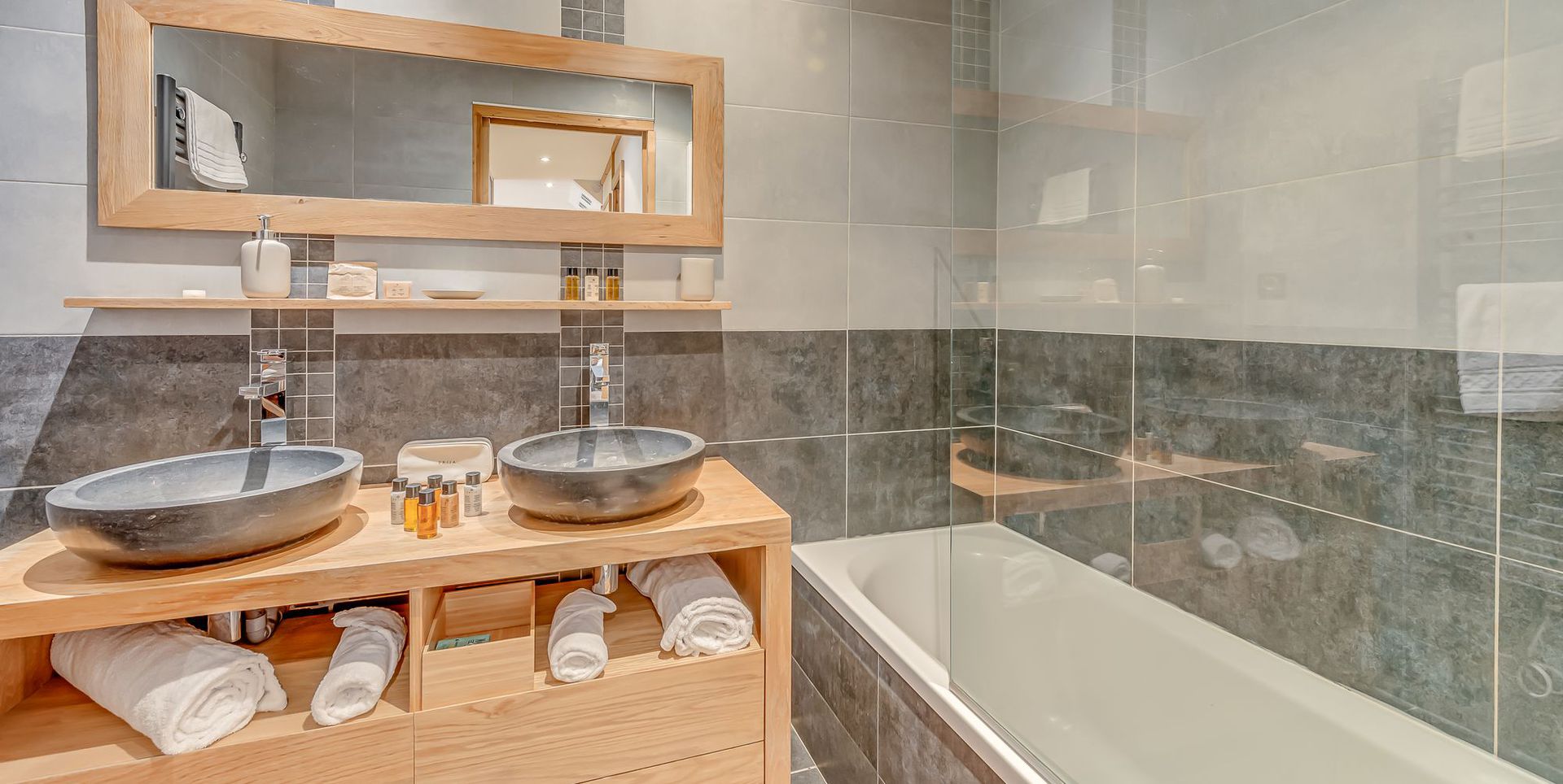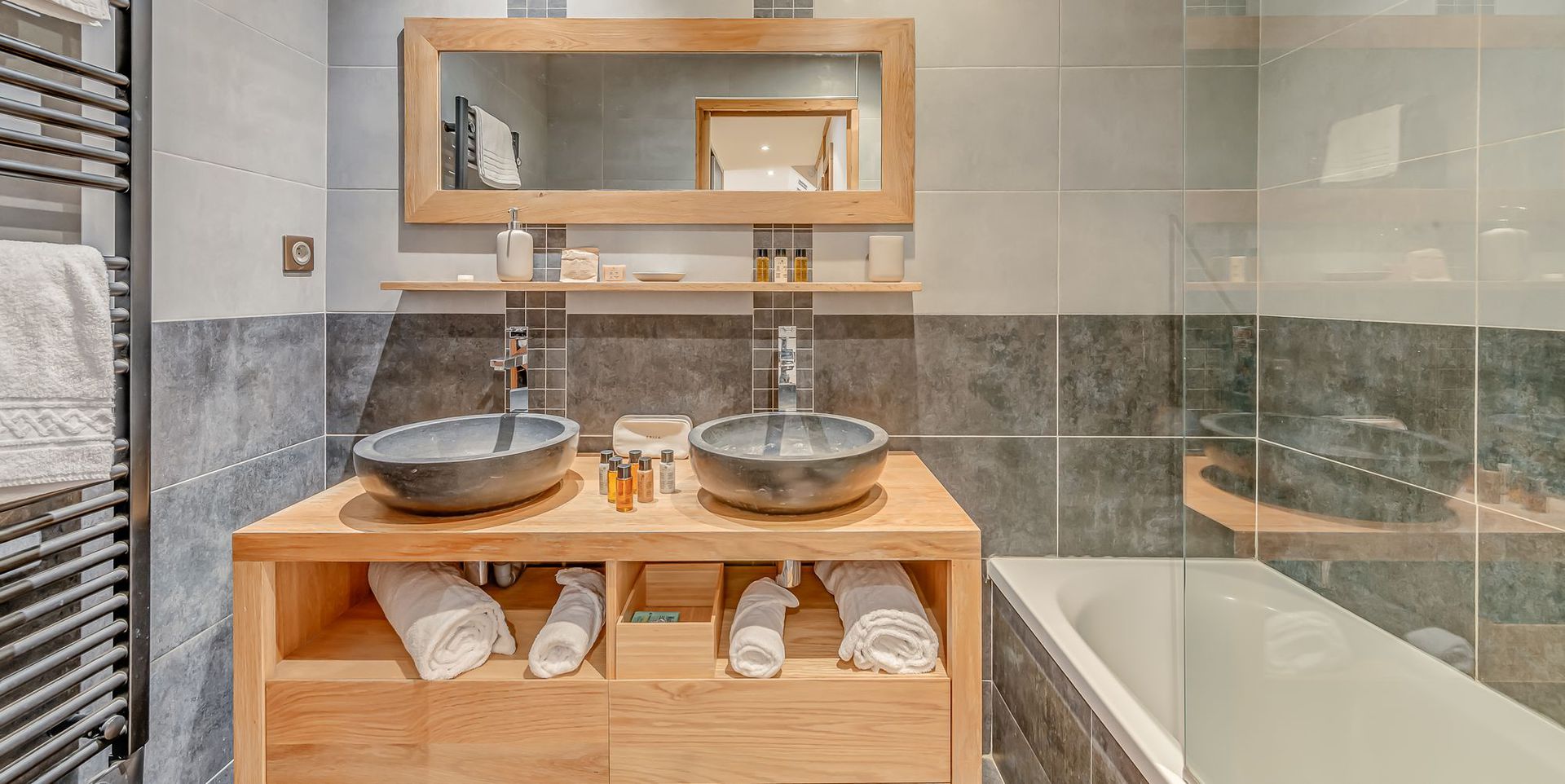 - 1 salle de bain avec baignoire, 1 meuble vasque et 1 radiateur seche serviette