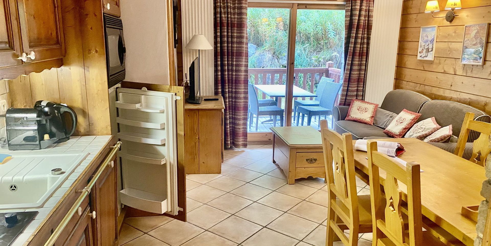 - 1 Sejour, salon, coin repas avec 1 grande table, 1 canape lit convertible 2 personnes, 1 TV et sortie sur terrasse EST