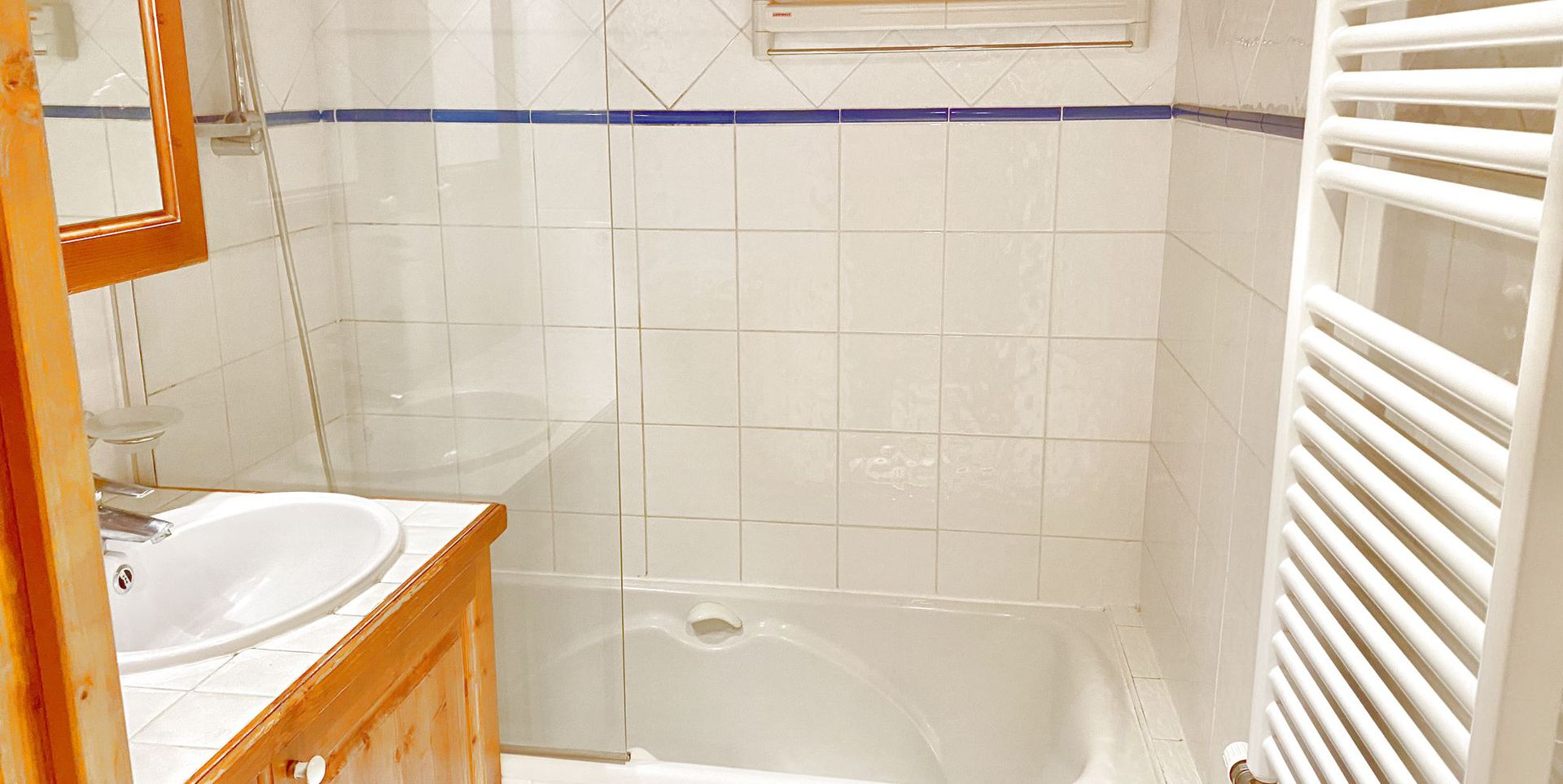 - 1 Salle de bains avec baignoire, pare douche en verre, meuble vasque et radiateur seche serviettes
