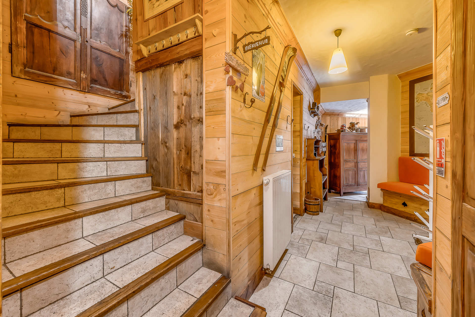 Niveau « 0 » - Grand hall d’entrée avec : 1 rack pour dépose des skis ,des banquettes, 1 chauffe chaussure pour 15 paires - Accès par quelques marches au Sauna, Hammam et douche.Buanderie avec lave-linge, sèche-linge et étendoir.