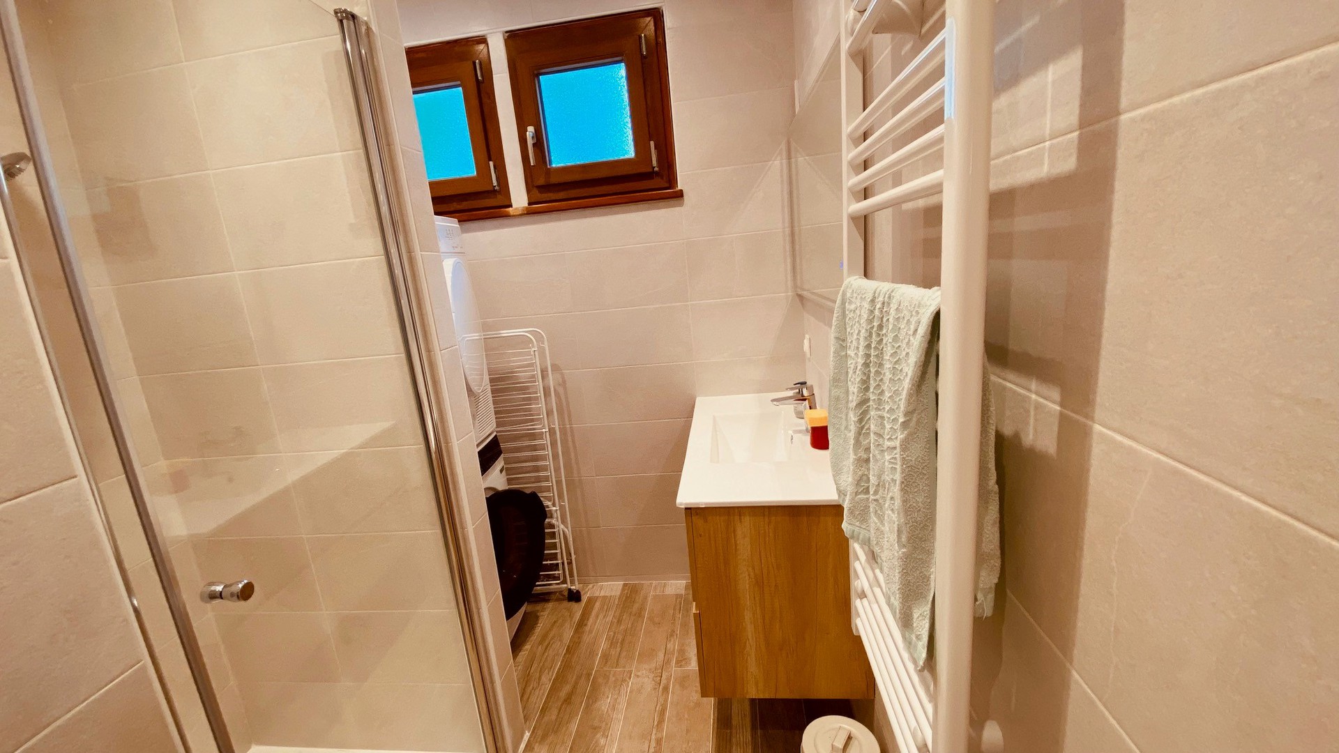 Entree sur Sejour avec cuisine ouverte (36 m2) avec coin salon : canape, fauteuils, table basse, television, baie vitree acces terrasse sud, cuisine ouverte sur sejour equipee: Lave-vaisselle, plaques induction, four, micro-ondes, refrigerateur, placards, hauts et bas, fenetre sud vue jardin - Salle d'eau : Douche a l'italienne, lavabo, lave-linge, seche-linge, rangements, fenetre nord vue champ - WC independants - Chambre 1 (9 m2) : 1 lit double, placards, fenetre nord vue champ - Chambre 2 (13.67 m2) : 1 lit double, placard, fenetre sud vue montagne - Chambre 3 (7.54 m2) : 2 lits, placard, fenetre nord - Jardin plat avec parasol, tables, chaises et BBQ.