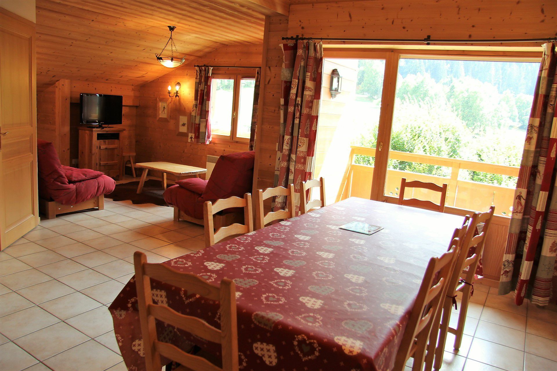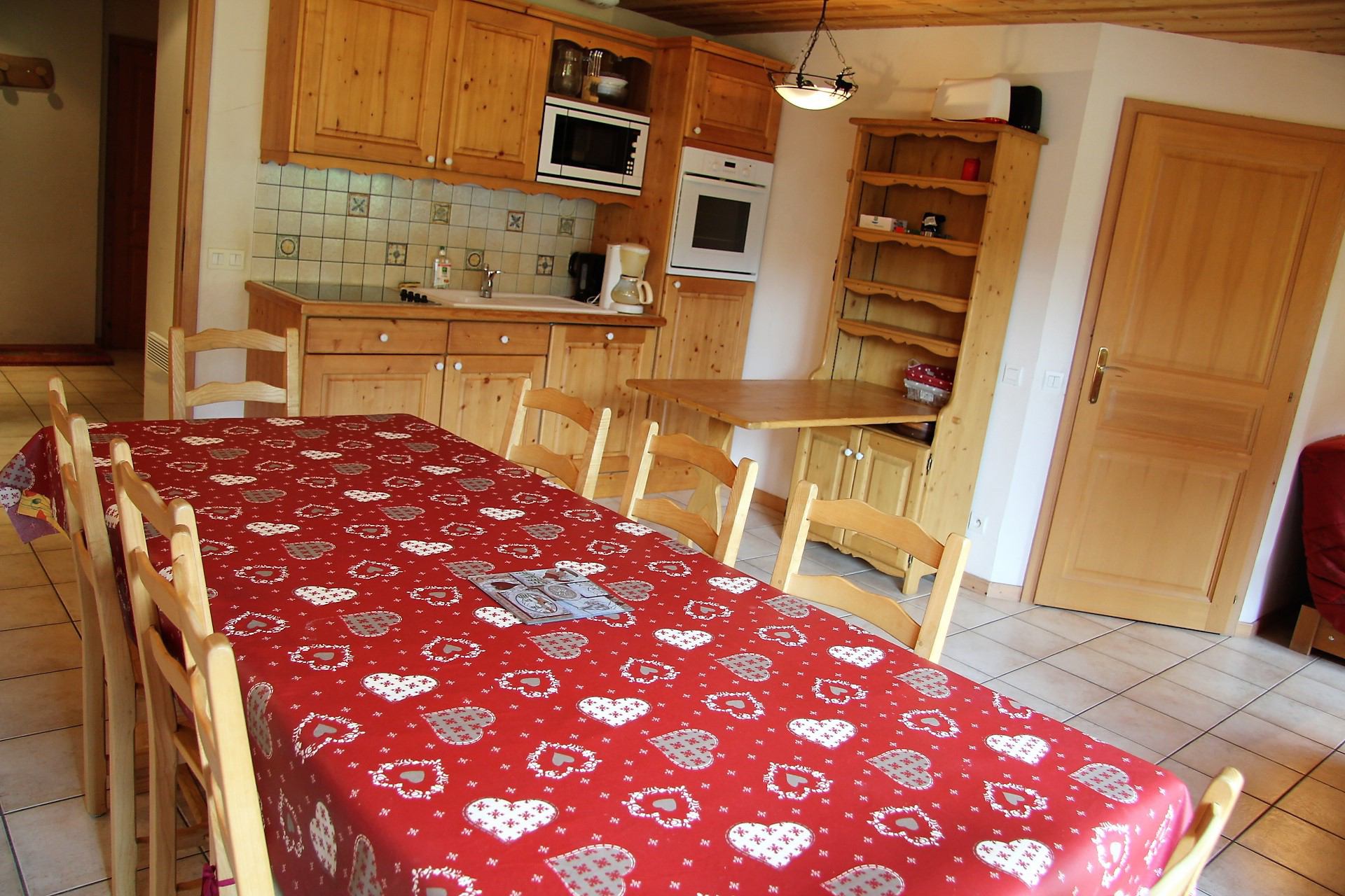 Entree/Hall : Placard - Salle de bains : Baignoire, lavabo, lave-linge, radiateur seche-serviettes - wc - Chambre 1 (8 m2 + 4 m2 inferieur a 1,80m) : 1 lit, placard, fenetre nord vue montagne - Chambre 2 : (8 m2 + 4 m2 inferieur a 1,80m) : 2 lits, rangement, velux - Chambre 3 (6 m2 + 4 m2 inferieur a 1,80m) : 2 lits, rangement, velux - Sejour (23 m2) avec Coin salon : Canape, television, fenetre sud vue montagne - Coin repas : Table et chaises, porte-fenetre acces balcon sud vue montagne. - Coin cuisine equipee : 4 plaques vitro-ceramiques, four, lave-vaisselle, hotte, refrigerateur (142L), four micro-ondes, placards,