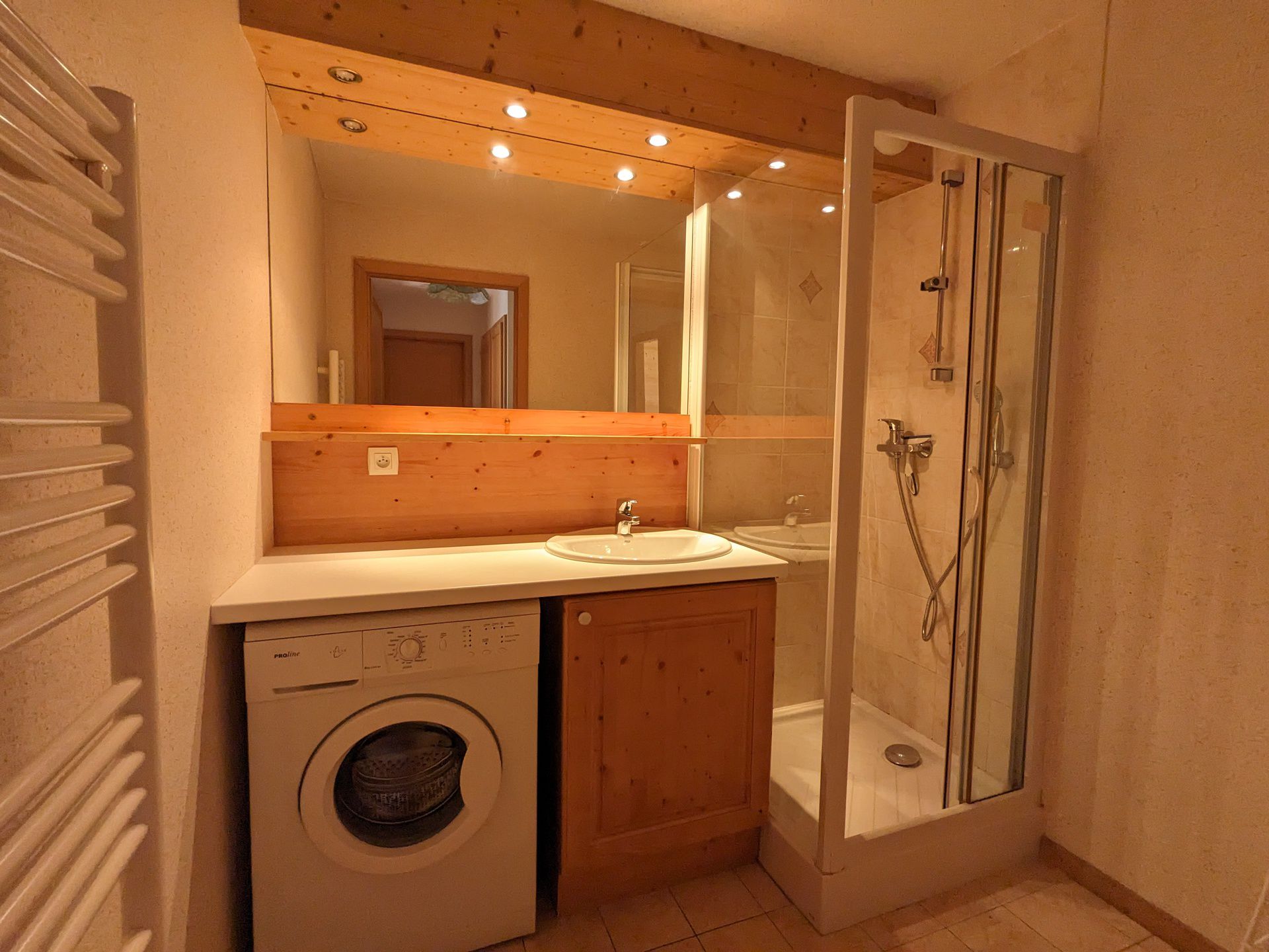 Entree/Hall (6.18 m2) - Salle d'eau : Cabine douche, lavabo, lave-linge, radiateur seche-serviettes - wc - Chambre 1 (9 m2) : 1 lit, placard, fenetre ouest vue montagne - Chambre 2 (9 m2) : 2 lits, placard, fenetre ouest vue montagne - Sejour (24 m2) : Coin salon avec canape, fauteuils, television, baie vitree acces terrasse sud, vue montagne - Coin repas avec table et chaises et banc - Coin cuisine equipee : 4 plaques vitro-ceramique, four, lave-vaisselle, refrigerateur (142L), micro-ondes, rangement.Couettes - Chauffage electrique - Casier a skis - Animaux non autorises.