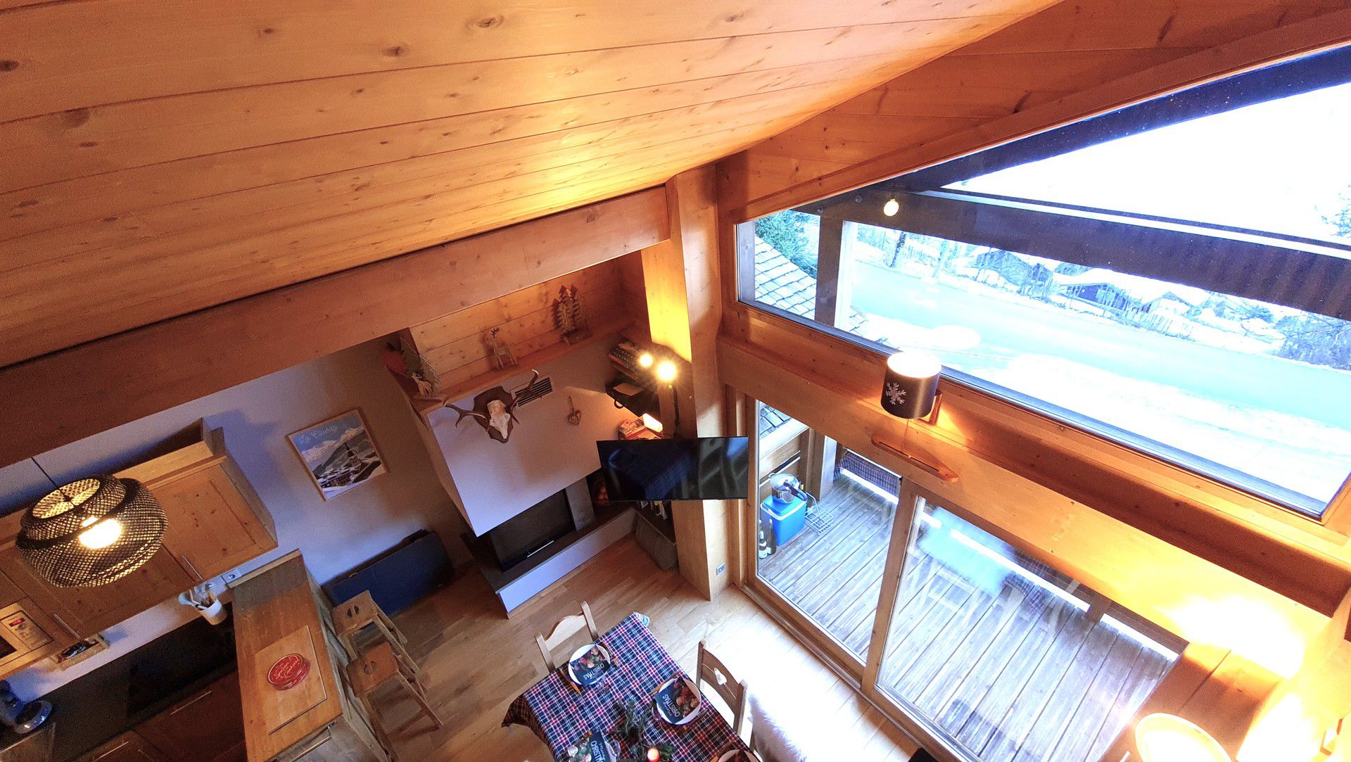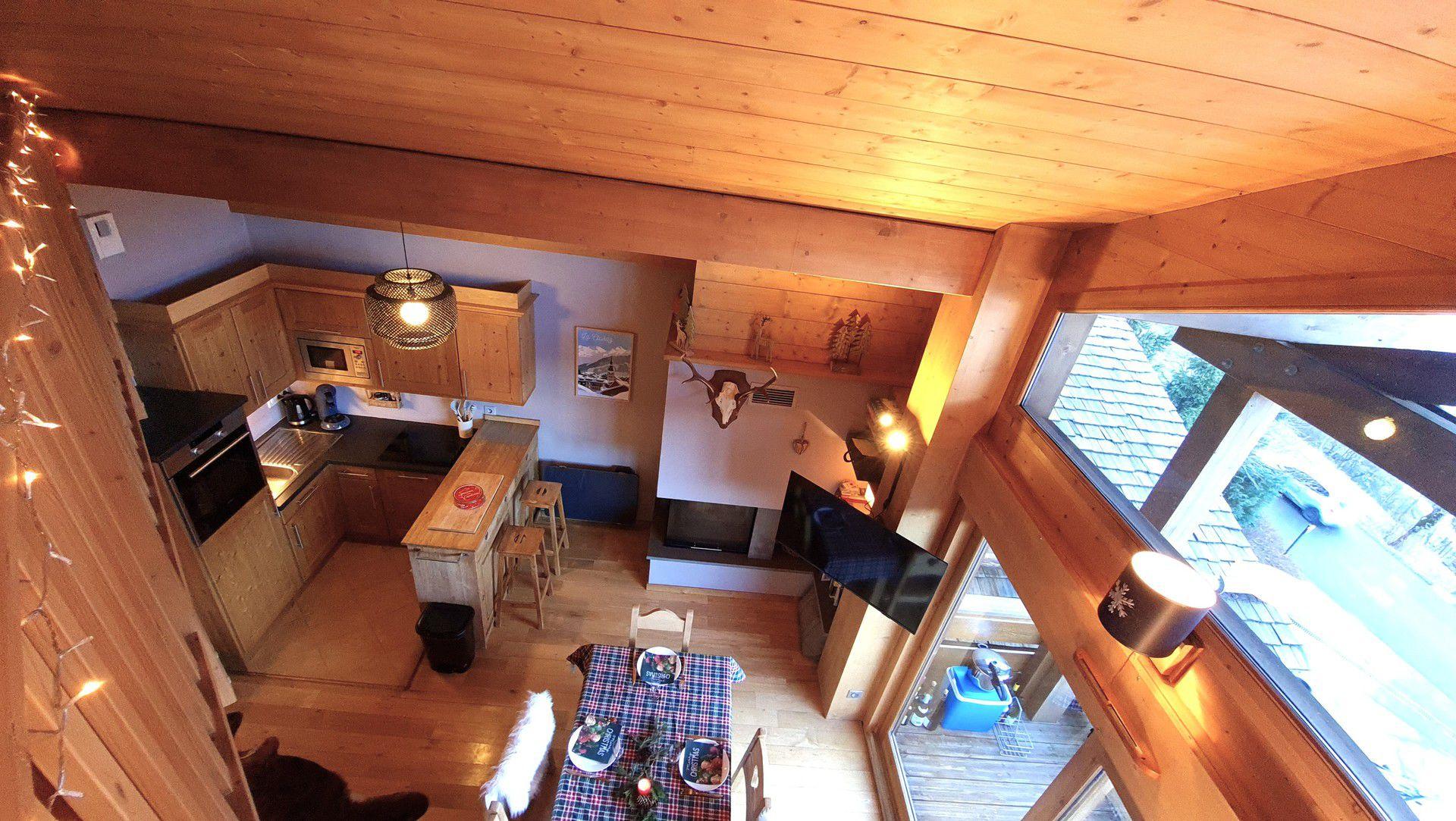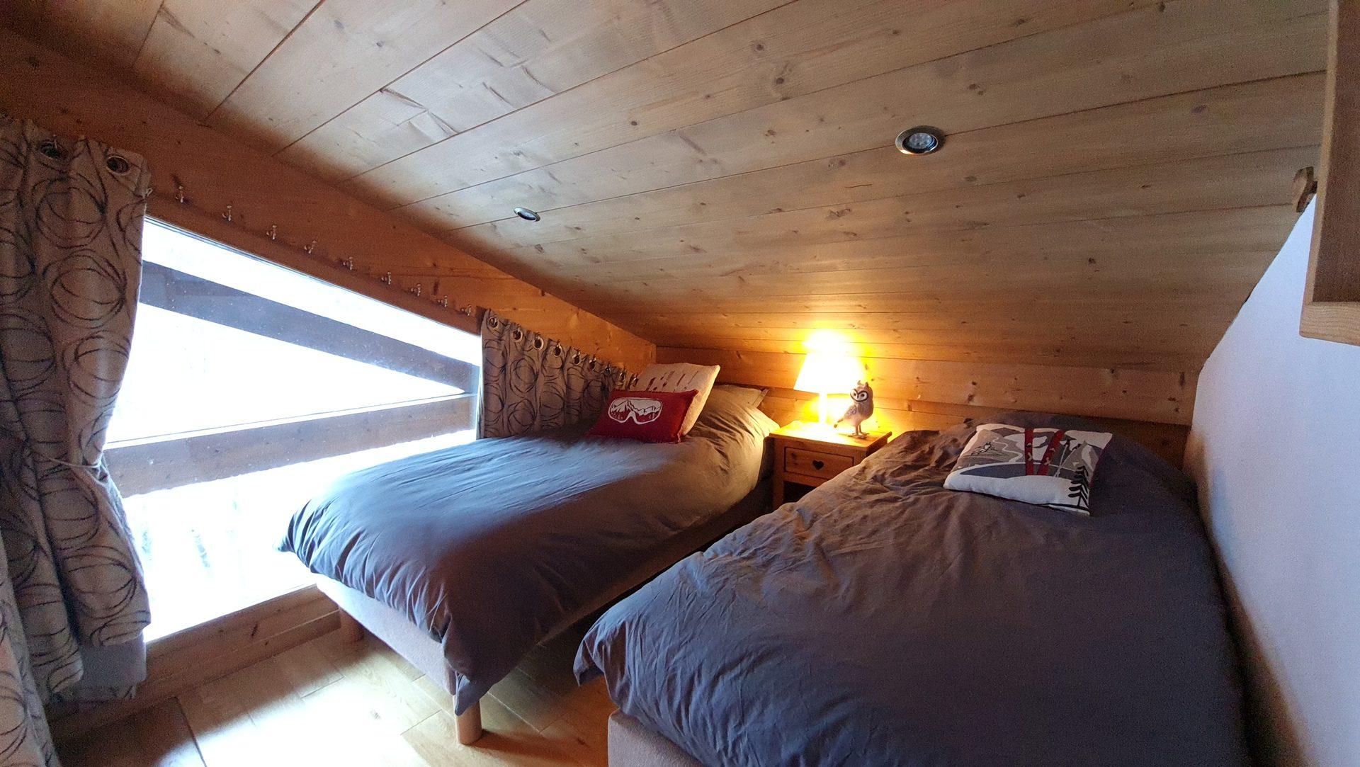 Etage superieur : Coursive ouverte sur sejour - Chambre 2 (10m2) : 1 lit double, velux - Chambre 3 (7m2) : 2 lits, fenetre sud vue pistes - wc avec lave mains - Placard avec lave-linge.