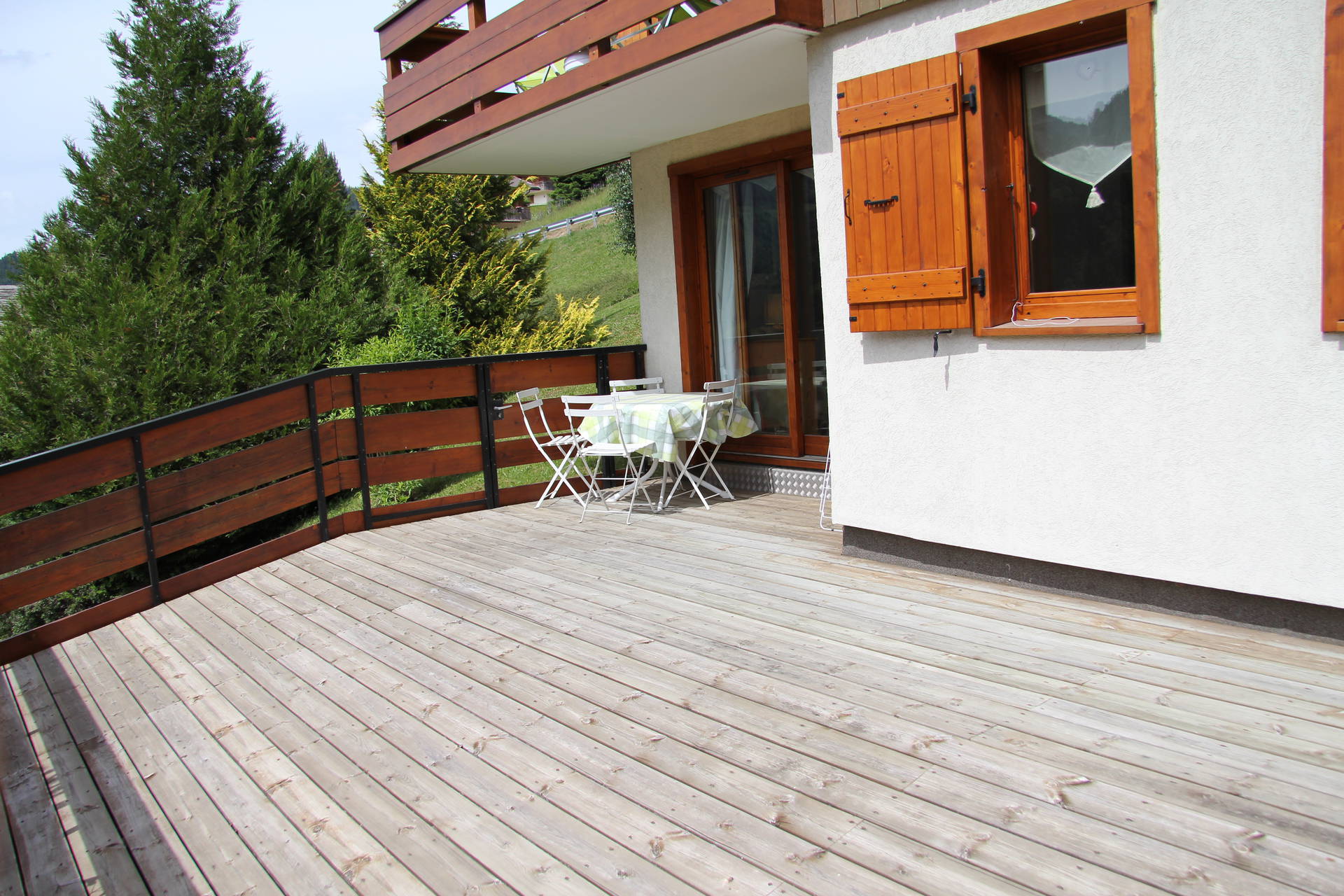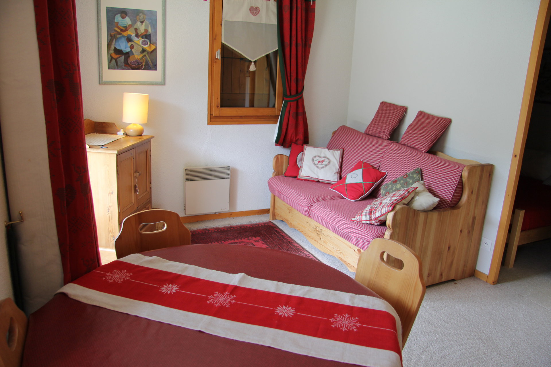 Entree : Penderie - Coin nuit (5 m2) : 2 lits, fenetre ouest vue montagne - Salle de bains : Baignoire, lavabo, lave-linge, seche serviettes electrique - wc - Salle de sejour (14 m2) avec Coin repas : Table et chaises - Salon : Banquette, petite table, television, baie vitree acces terrasse ouest vue montagne, fenetre nord vue montagne - Cuisine equipee (1.72 m2) : Four, refrigerateur (112L), hotte, 4 plaques electriques, lave-vaisselle, rangement - Chambre ( 7 m2) : 1 lit, placard, fenetre nord vue montagne.