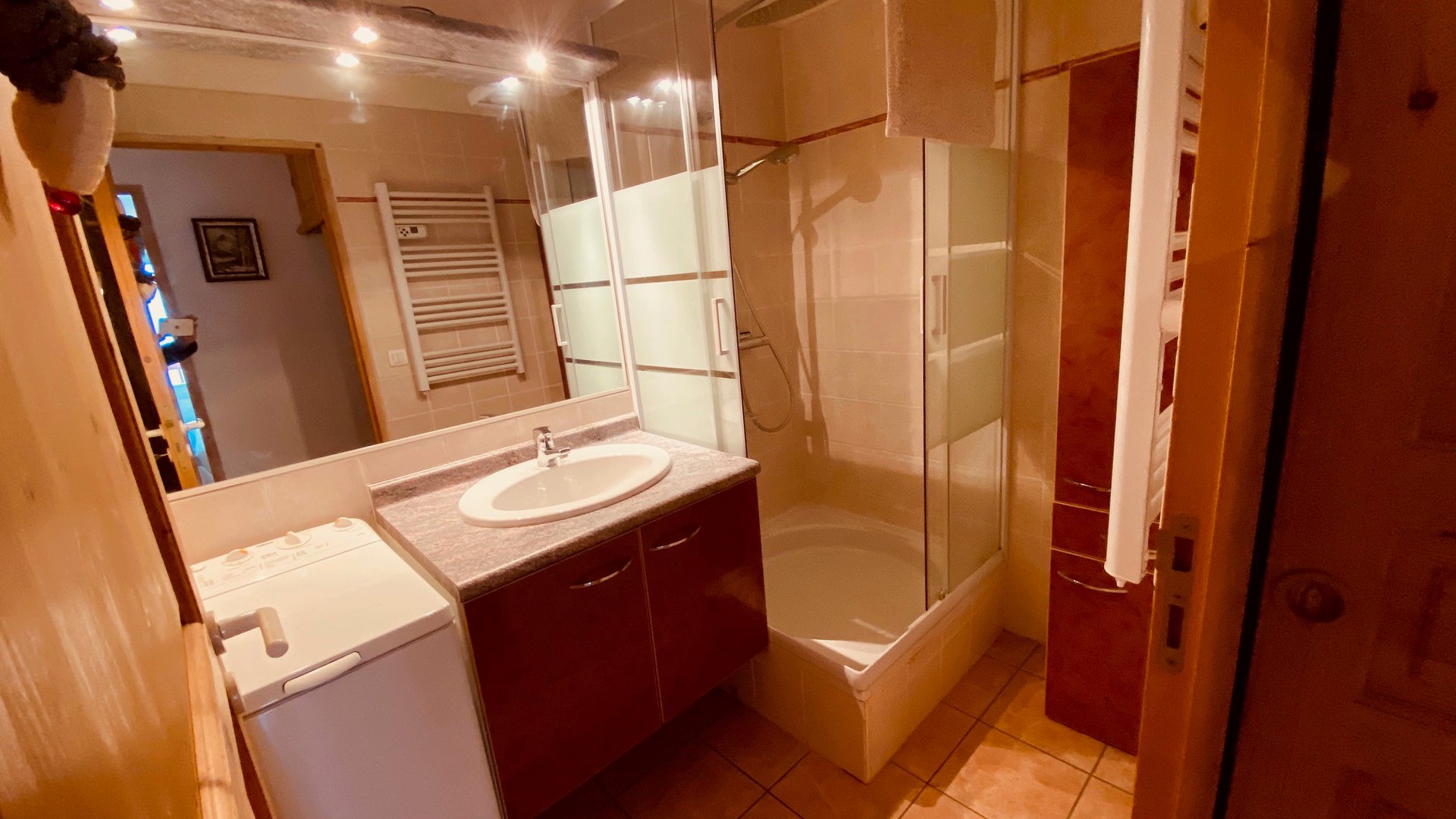 Entree / Hall (2.30 m2) : Placard - wc avec lave-mains - Sejour (23 m2) : avec Coin salon : Canape, television, cheminee, table basse - Coin repas : Table et chaises, baie vitree acces balcon sud, vue montagne - Coin cuisine equipee : Refrigerateur (100L), 2 plaques vitroceramique, four multifonction (four et micro-ondes), hotte, lave-vaisselle, placards, bar passe-plats - Couloir : Placard - Chambre (10 m2) : 1 lit, penderie, baie vitree acces balcon sud - Salle d'eau : Douche, lavabo, lave-linge.