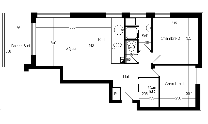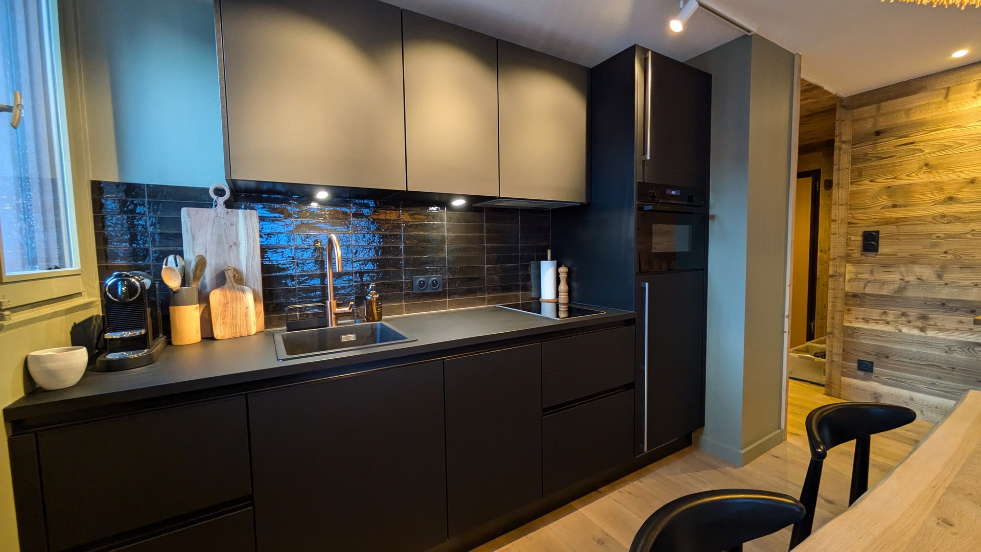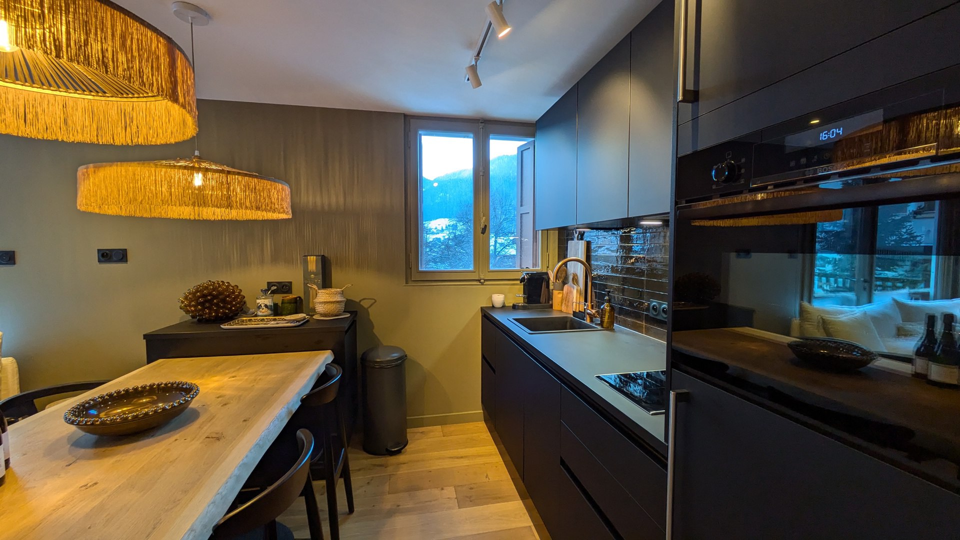 Entree / Hall desservant : Coin nuit (2.80 m2) avec deux lits superposes - Chambre 1 (7.20 m2) : 1 lit double, placard/penderie, TV, fenetre nord - Chambre 2 (10 m2) : 1 lit double, placard/penderie, TV, fenetre nord - Salle d'eau : Douche, lavabo, miroir, seche-serviettes electrique, fenetre Ouest - WC suspendus - Sejour (23 m2) avec Coin repas : table et chaises - Cuisine equipee ouverte sur sejour: evier, four combine micro, plaques a induction 2 feux, hotte, refrigerateur avec congelateur (116L), lave-vaisselle, placards, appareil a raclette, appareil a fondue, Nespresso, grille-pain, bouilloire - Coin salon : Canape, assises, TV, baie vitree acces balcon sud vue residence et pistes de ski Aiguille et Merle.