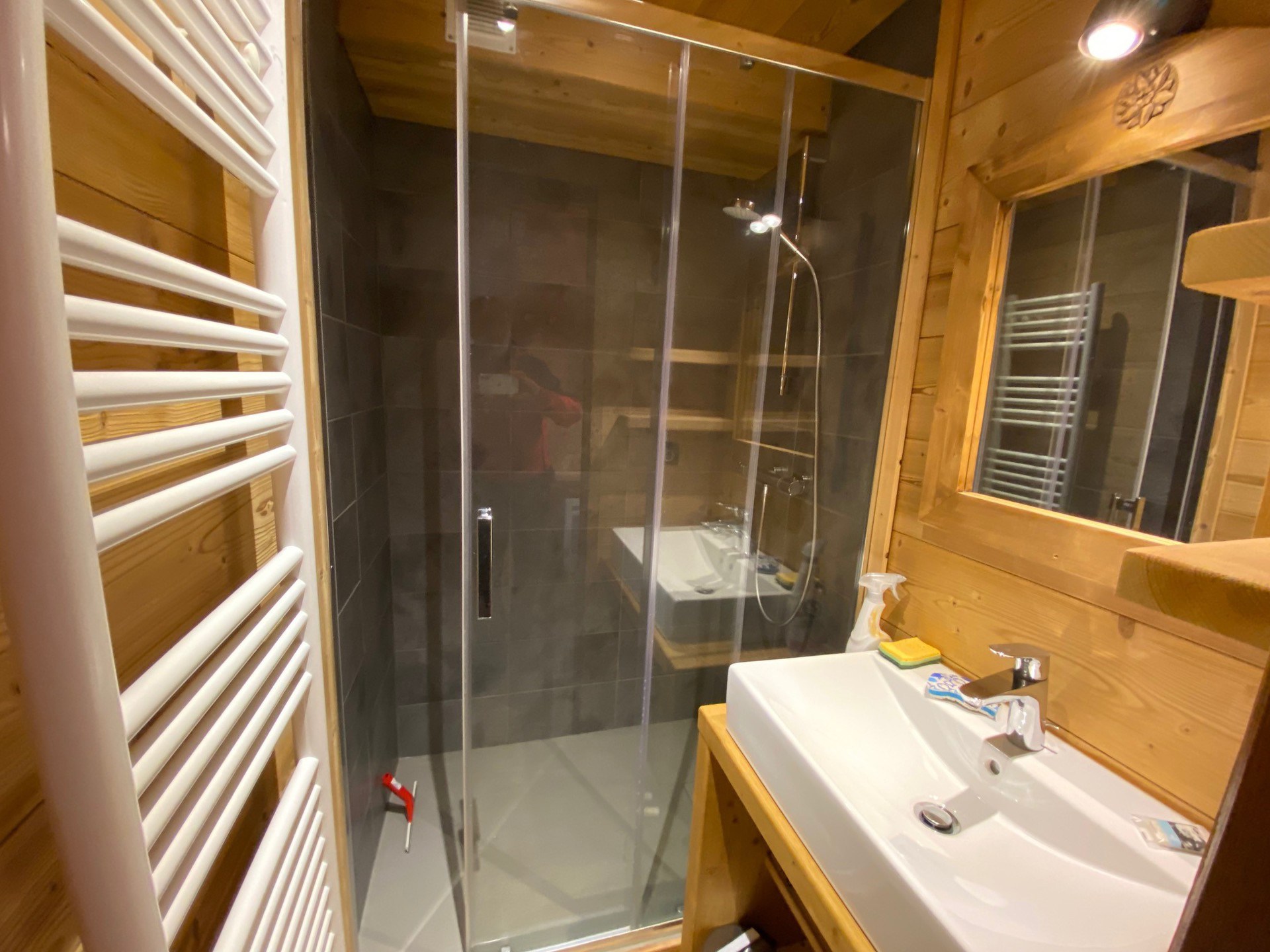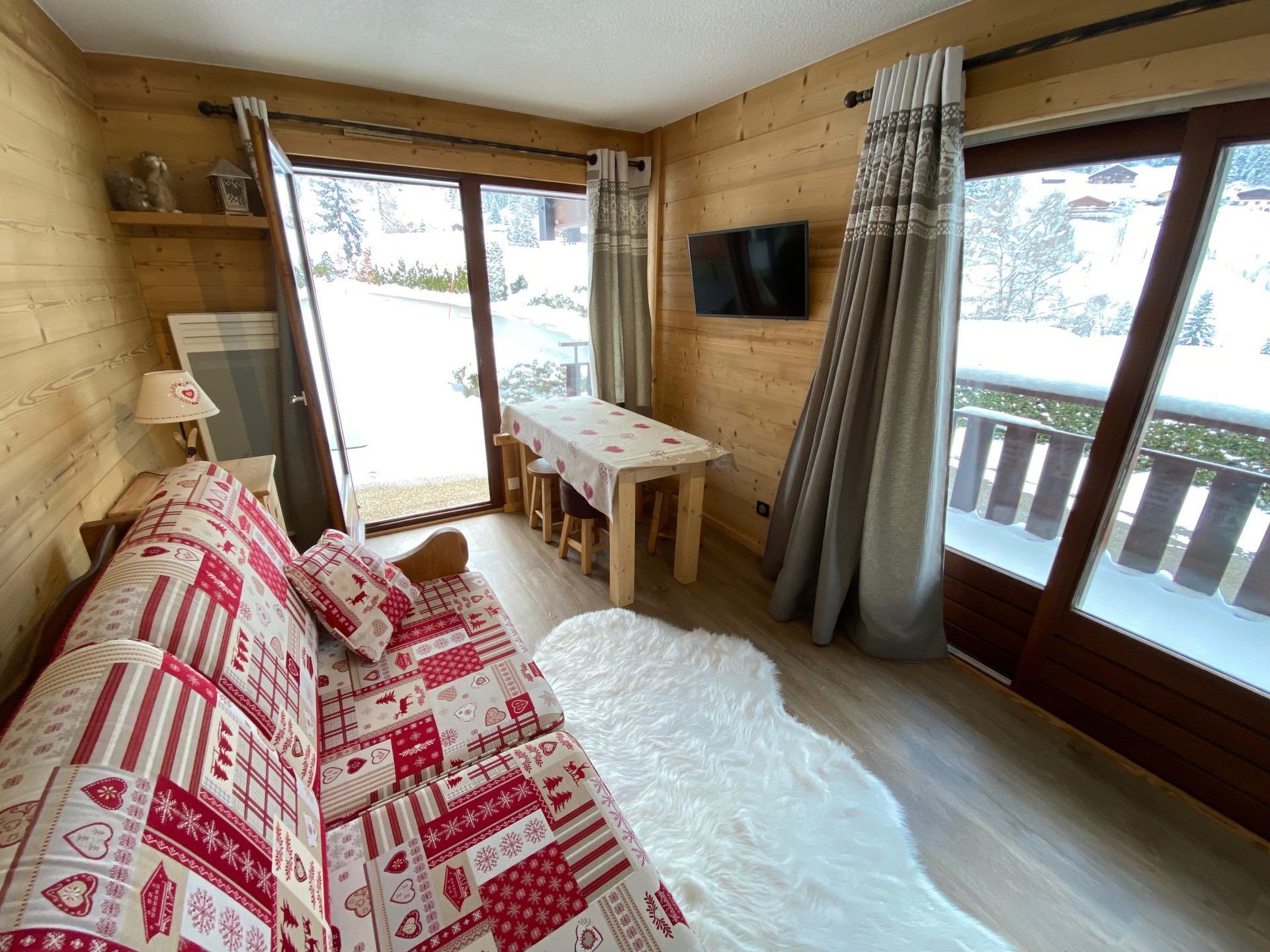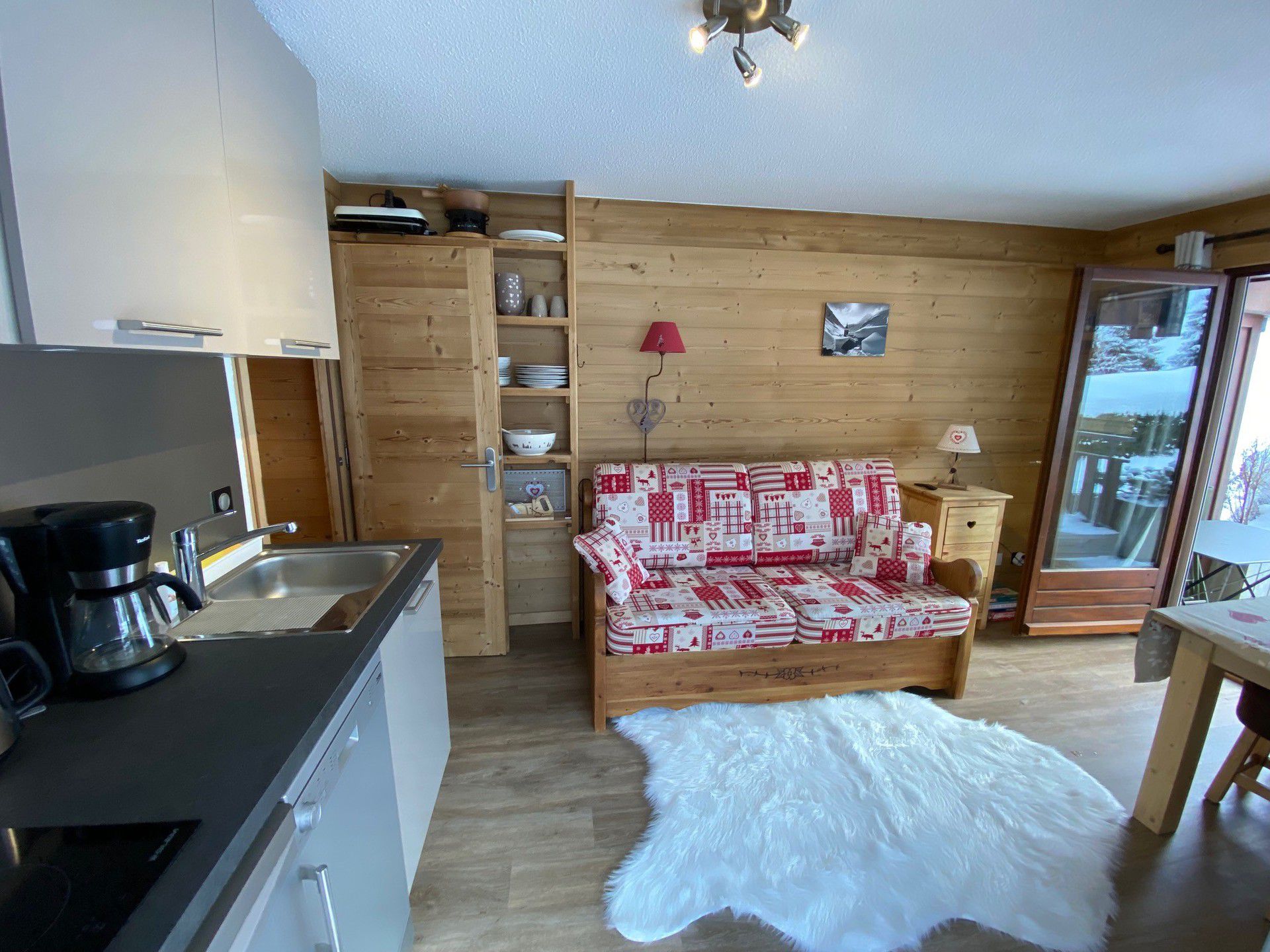 Entrée/Hall avec placard-penderie - Cabine (chambrette) (3.50 m²) : Lits, fenêtre ouest vue beauregard - Salle d’eau avec cabine douche, meuble avec vasque, sèche serviette - wc avec ballon eau chaude - Séjour (14m²) avec Coin repas : table et tabourets - Coin salon : Canapé, télévision, baies vitrées accès terrasse sud et terrain et balcon côté ouest - Coin cuisine équipée : four, réfrigérateur (90L), lave-vaisselle, grille-pain, 2 plaques induction, plan de travail, évier 1 bac, placards hauts et bas.