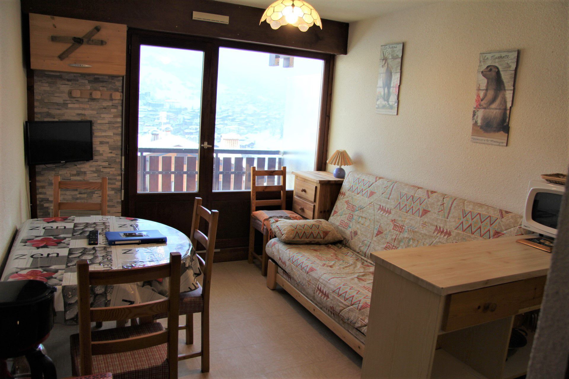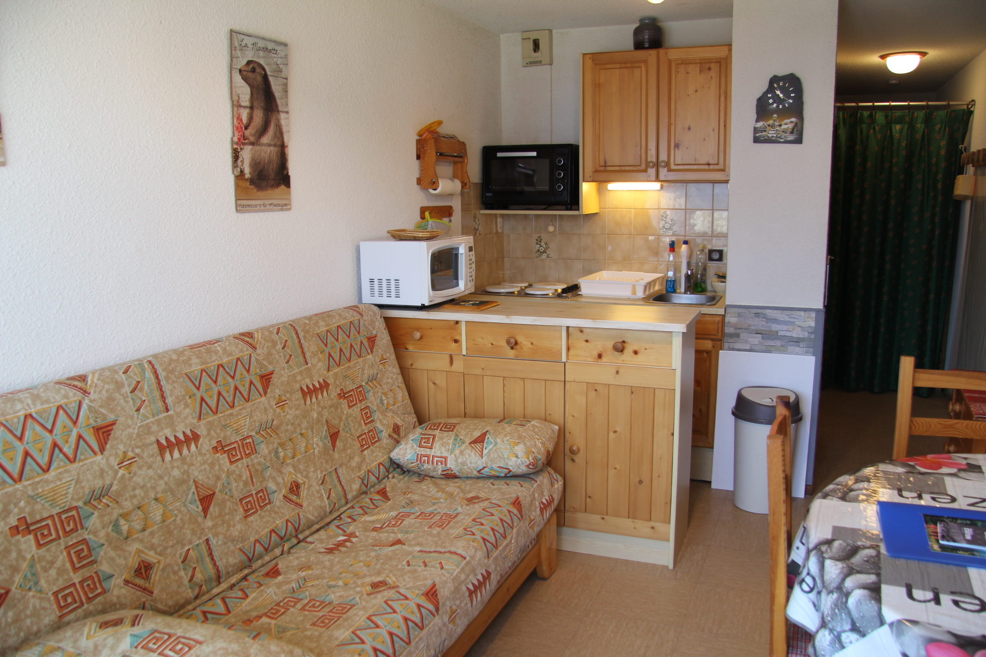 Entrée/Hall - Coin nuit (5,60 m²) : 3 lits, fenêtre nord sur coursive - Salle d'eau : Douche, lavabo, lave-linge, WC - Séjour (10 m²) avec Coin repas : Table et chaises - Coin salon : Canapé, télévision, baie vitrée accès balcon est sud vue village et la chaîne des Aravis - Coin cuisine : Plaque électrique 4 feux, micro-ondes, réfrigérateur (90L), four, bar passe-plat.
