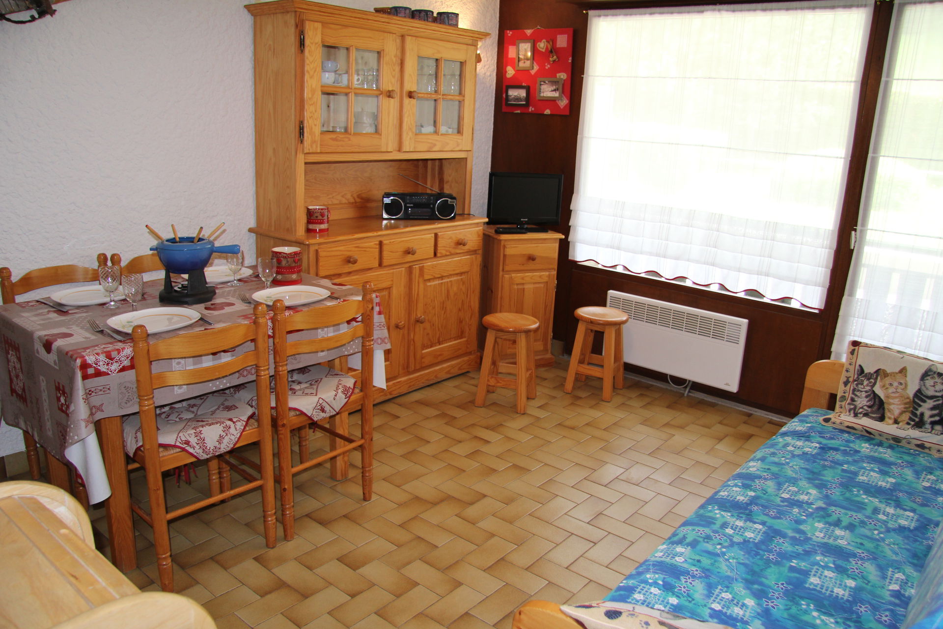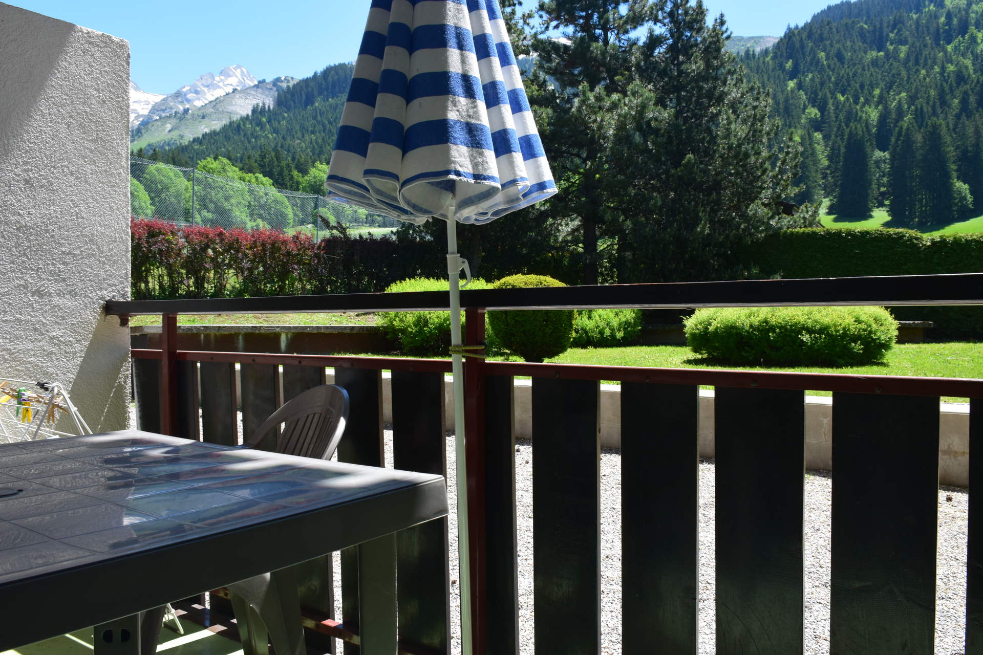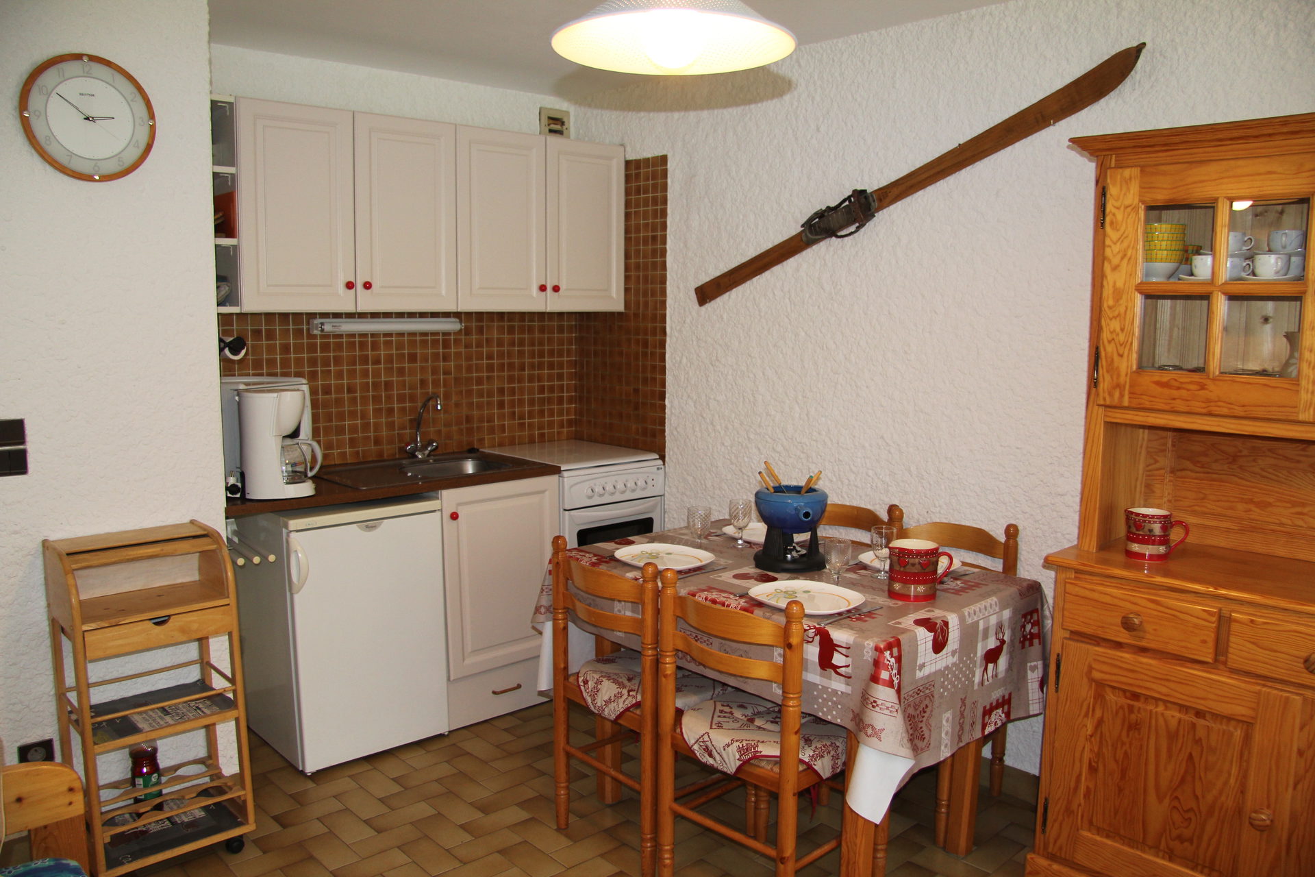 Entree / Hall : Placard-penderie - Coin nuit (5 m2) : lit double, fenetre sur coursive, penderie - Salle d'eau : Douche, lavabo et wc - Sejour (12 m2) : Coin salon : Canape, table, television, baie vitree sud acces balcon vue montagne - Coin repas : Table et chaises - Coin cuisine equipee : Cuisiniere electrique avec four, micro-ondes, refrigerateur (90L), placards