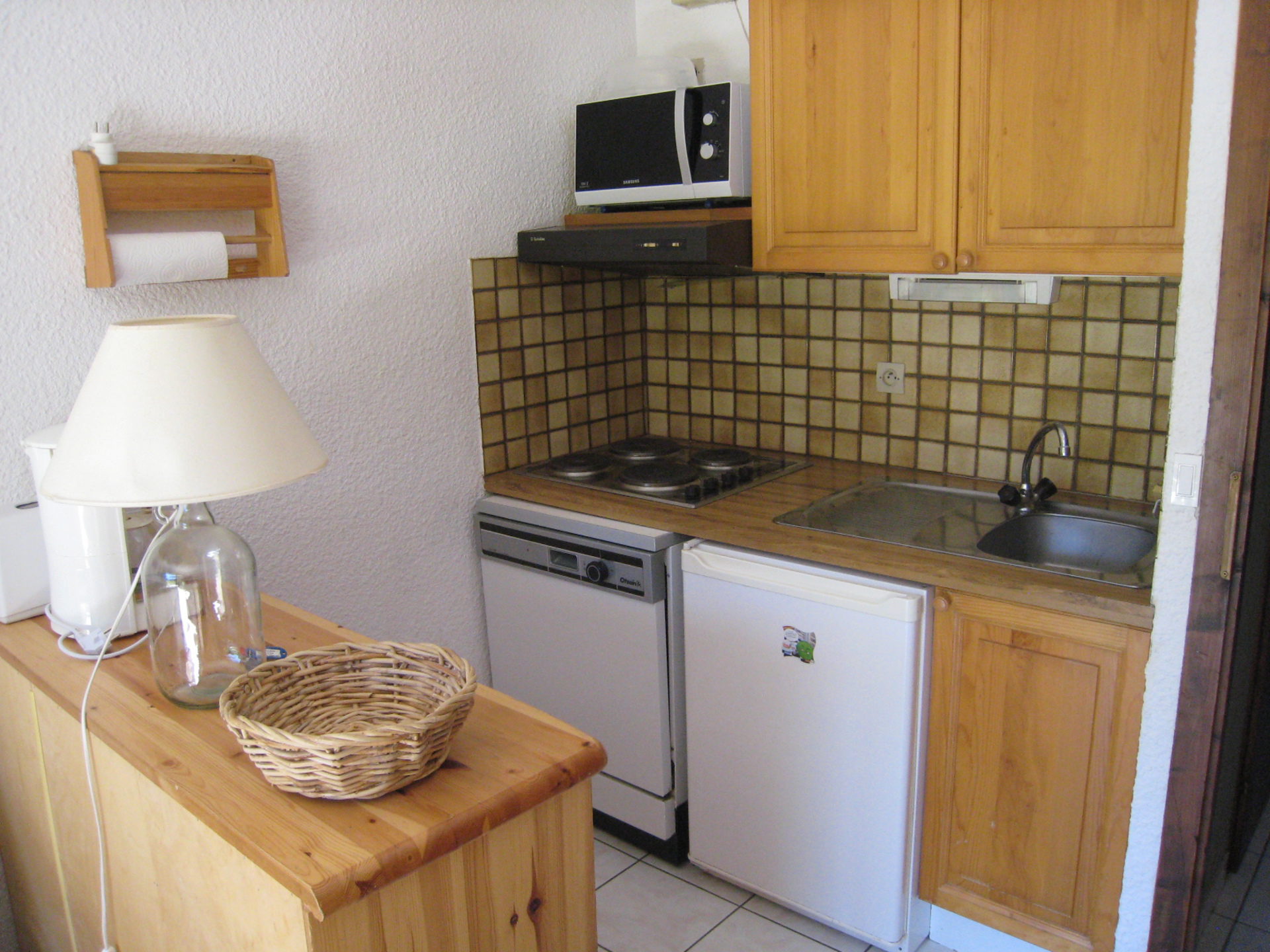 Entrée/hall avec placard-penderie - Coin montagne en couloir (4,50 m²) : 2 lits - Salle de bains : Baignoire, lavabo, fenêtre nord vue champ - wc - Séjour (13m²) avec Coin repas : Table de berger amovible et chaises - Coin salon : Canapé, télévision, baie vitrée accès terrasse sud vue montagne - Coin cuisine équipée : Four micro-ondes, réfrigérateur (115L), hotte, lave-vaisselle, 4 plaques électriques.