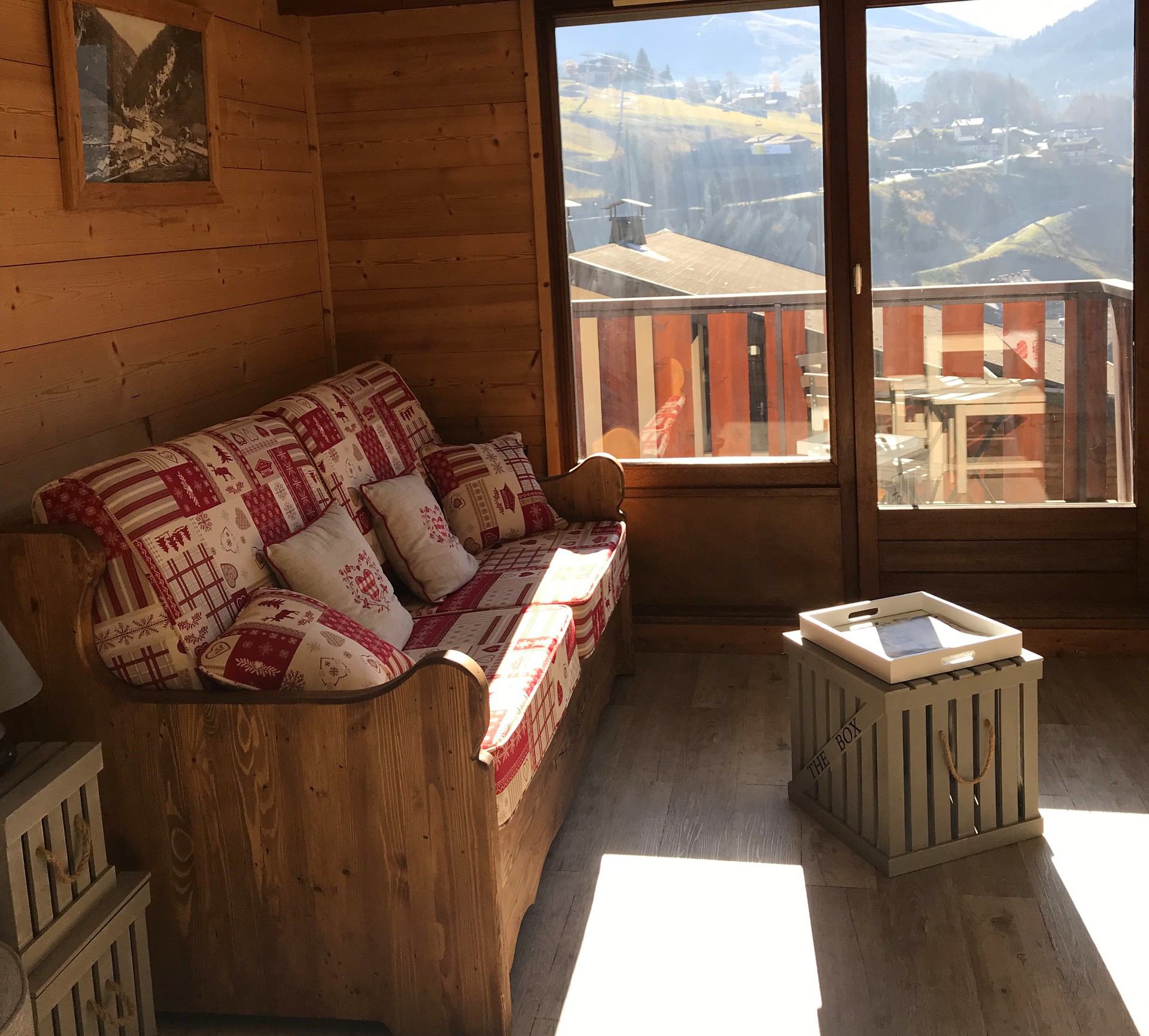 Entree/Hall : Placard - Coin nuit en couloir : Lits - Salle de bains : Baignoire, lavabo - wc separe avec cumulus - Sejour (13 m2) avec Coin salon : Canape, television, table basse, baie vitree acces balcon sud vue village - Coin repas : Table et chaises - Coin cuisine equipee : 4 plaques electriques, hotte, refrigerateur, micro-onde, appareil a raclette, lave-vaisselle, placards.
