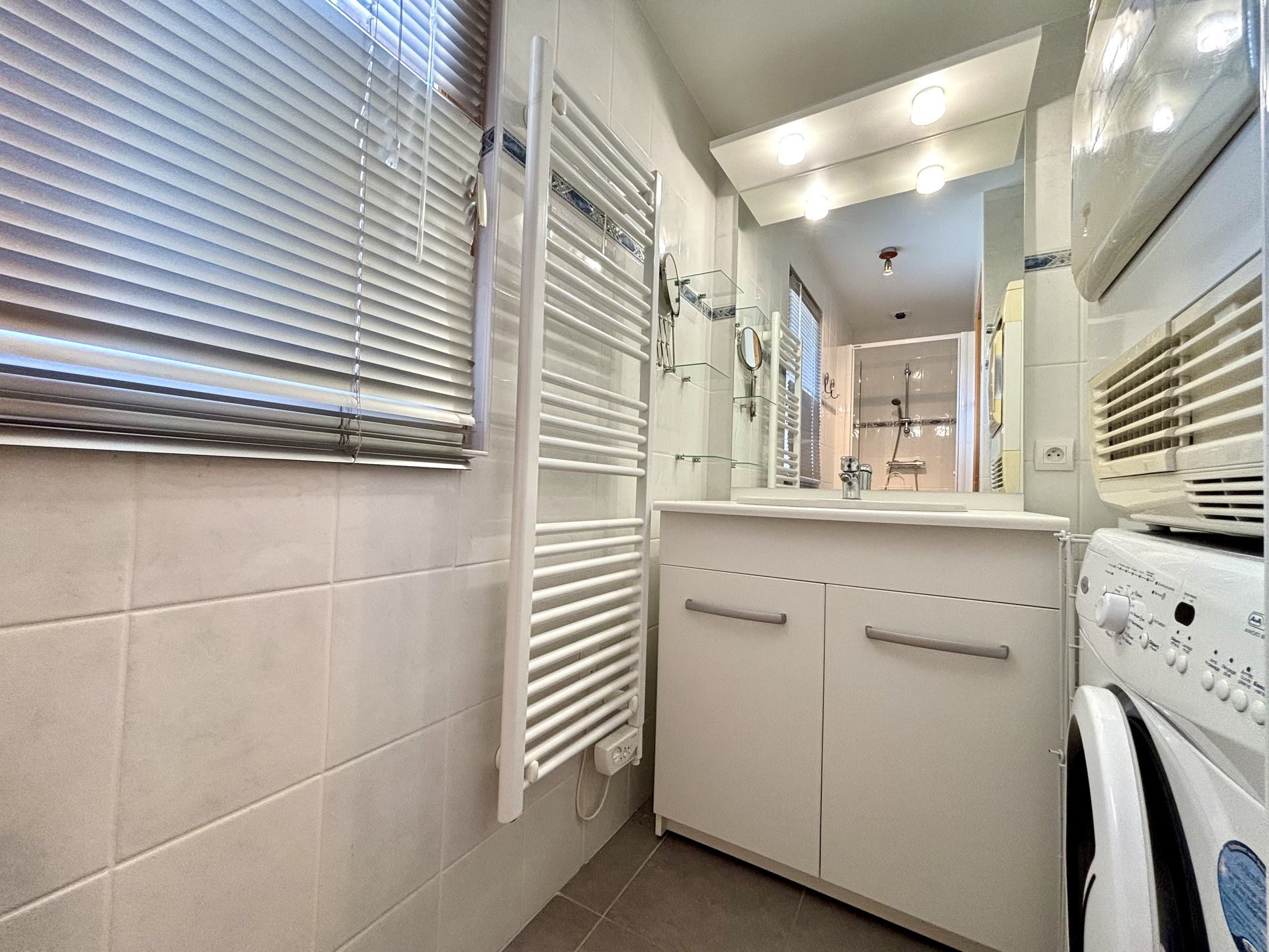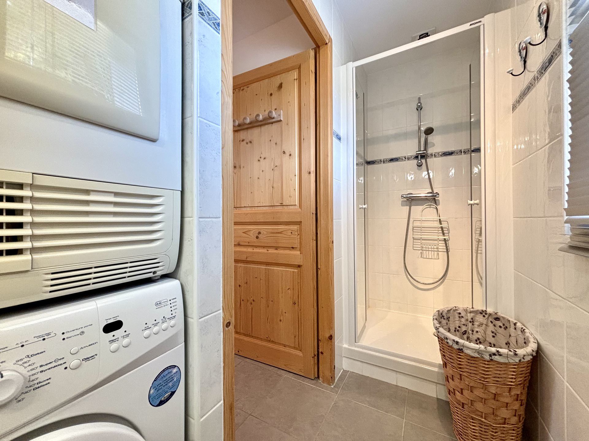 - Une salle d'eau avec douche, meuble vasque, lave-linge et seche-linge