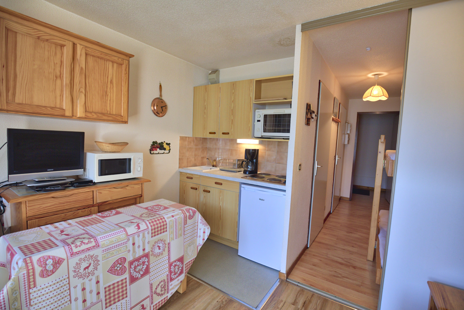 - Cuisine ouverte sur séjour : quatre plaques électriques, mini four, micro-ondes, réfrigérateur.