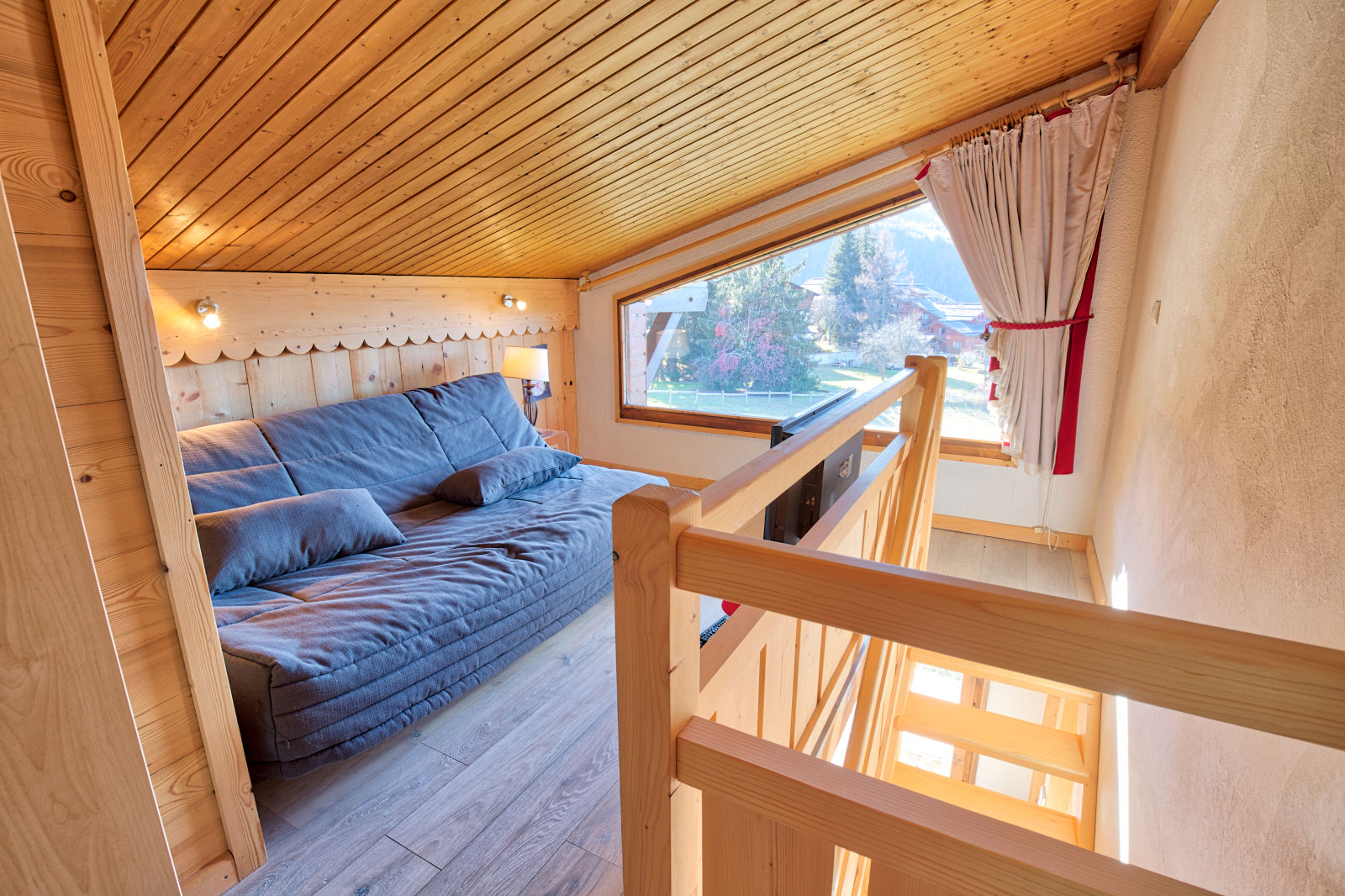 - Une mezzanine (coin salon) equipee d'un canape convertible (140 cm) et television