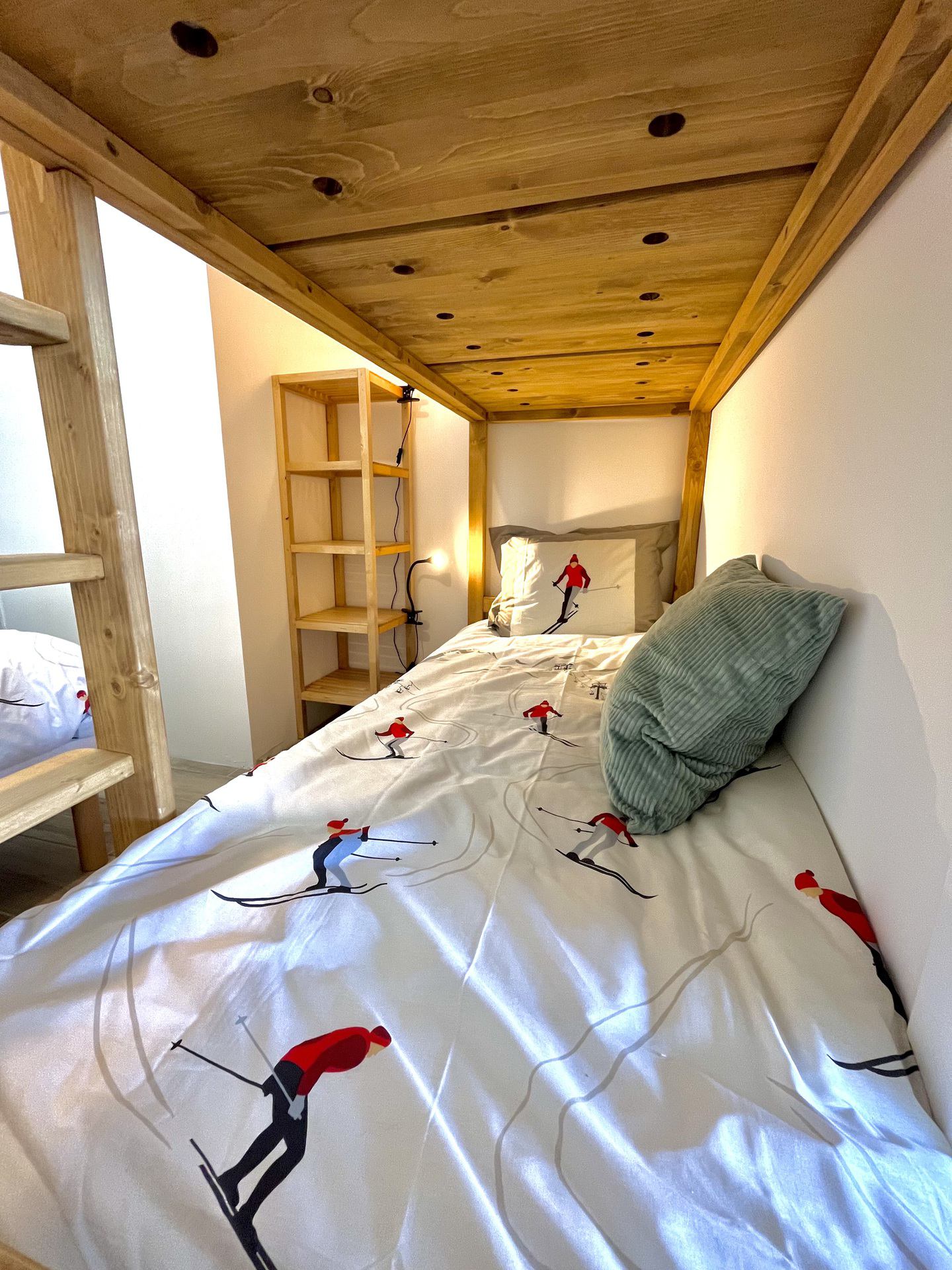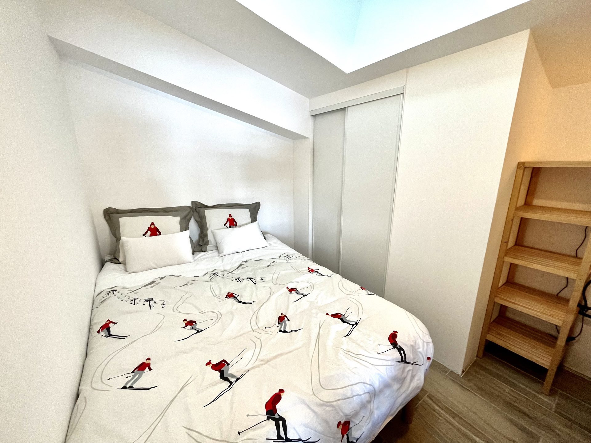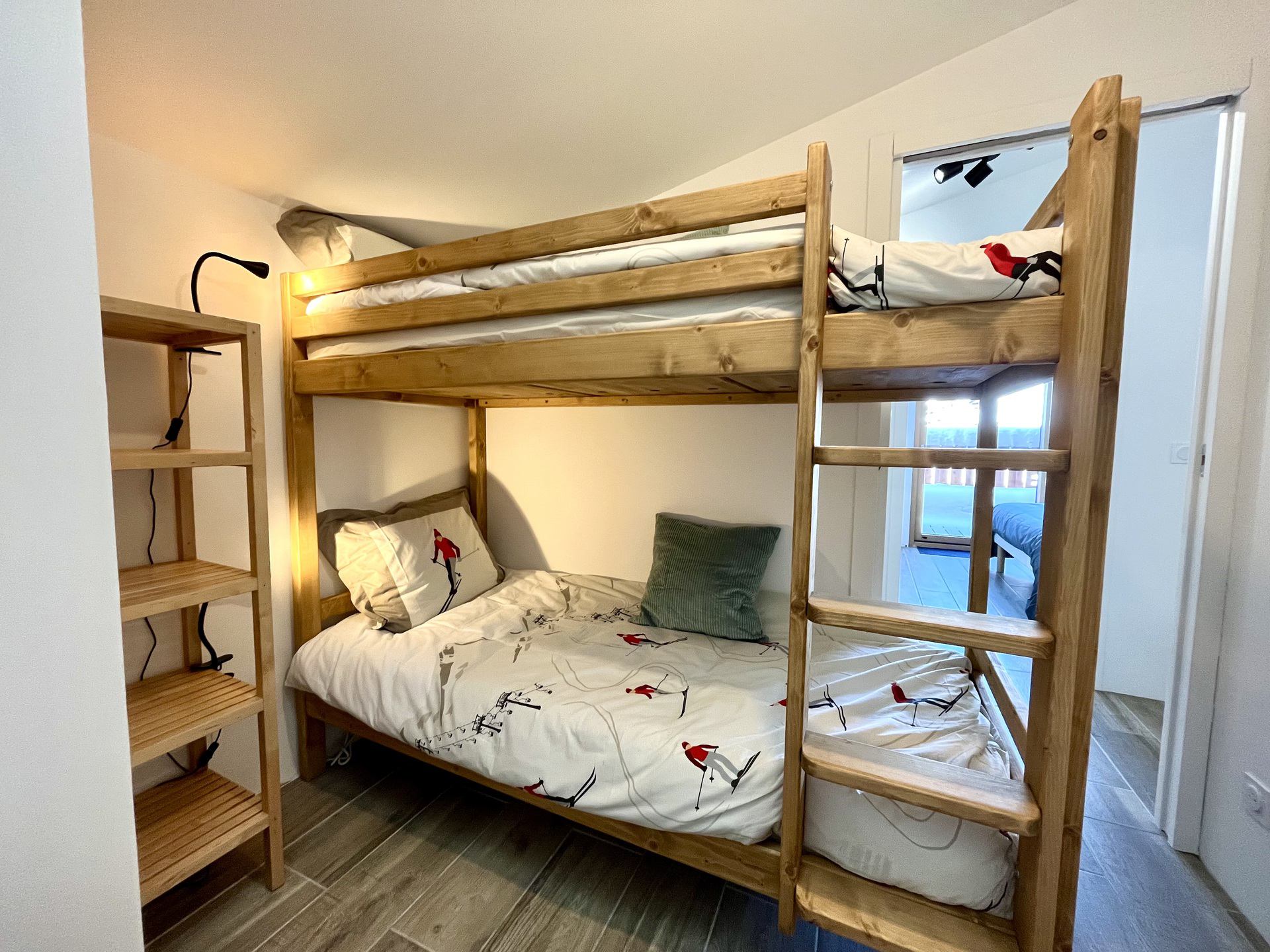 - Une chambre avec placards, un lit double (140 cm) et lits superposes (2 * 90 cm)
